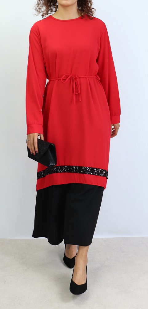 Tunique en crêpe avec strass noirs - Couleur Rouge Vetement & Accessoire