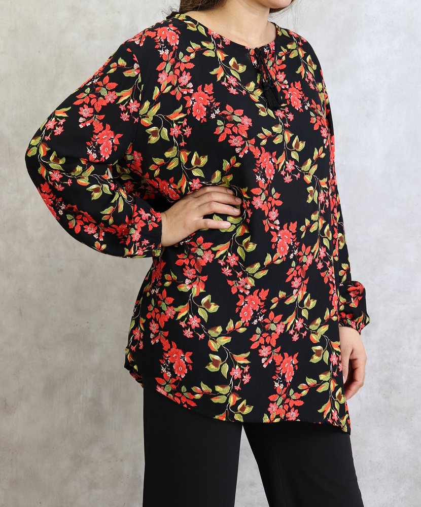 Tunique noire a fleurs oranges pour femme (Grandes tailles disponibles)