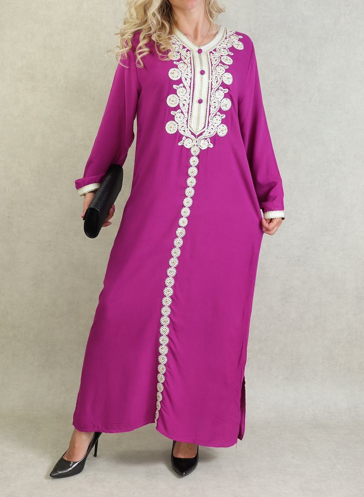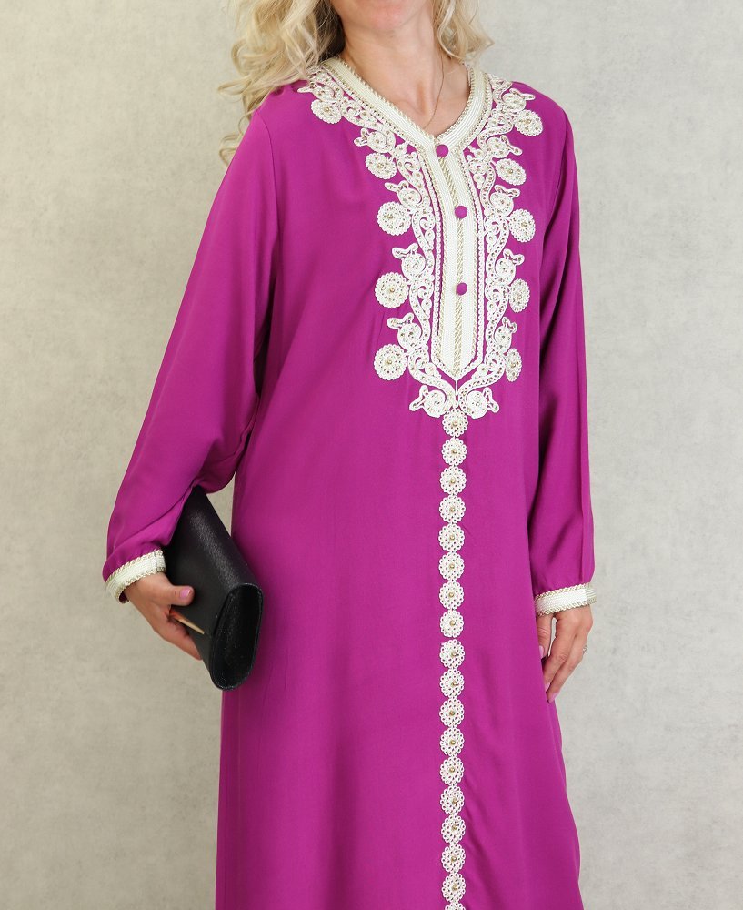 Robe Algerienne longue avec broderie et strass style caftan - Couleur Magenta