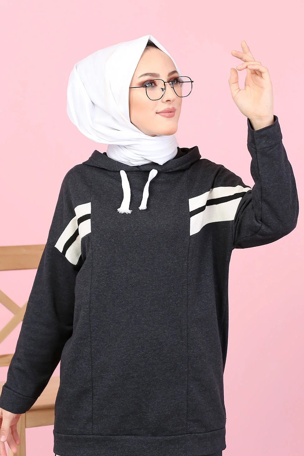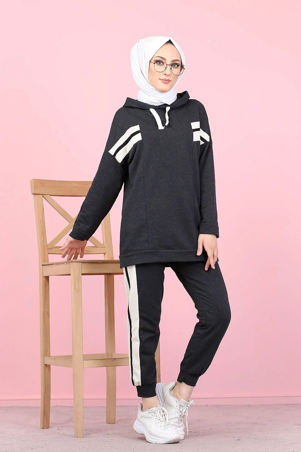 Survêtement 2 pièces composé d'un sweat mi long, capuche avec liens de serrage, coupe droite et d'un bas taille élastique. La signature de ce modèle : deux bandes larges blanches et une bande fine noire.