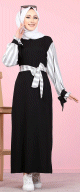 Robe-chemise longue boutonnée avec ceinture assortie et fleurs rouges sur les manches.