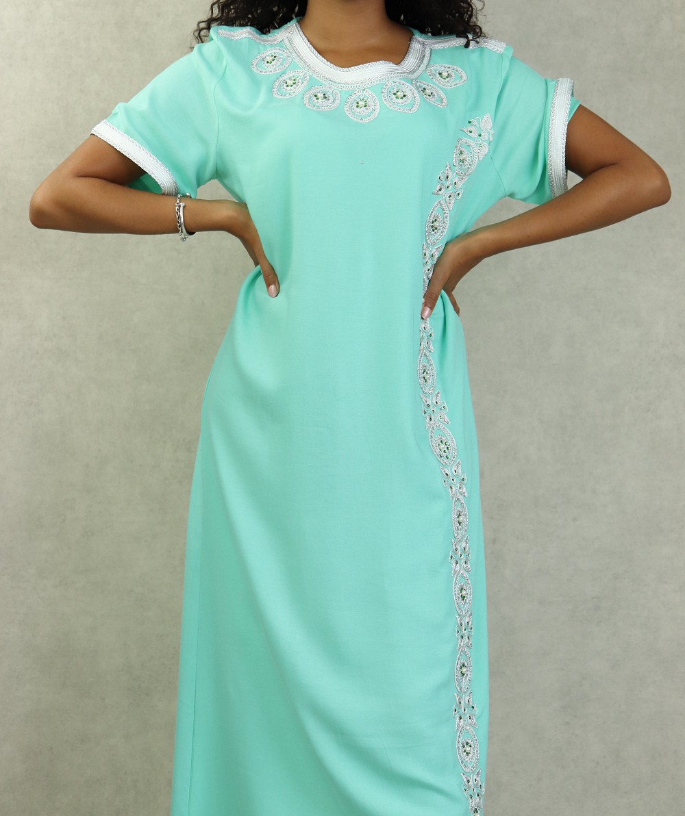 Robe orientale algérienne à manches courte brodée et perlée pour femme - Couleur Vert d'eau Vetement & Accessoire
