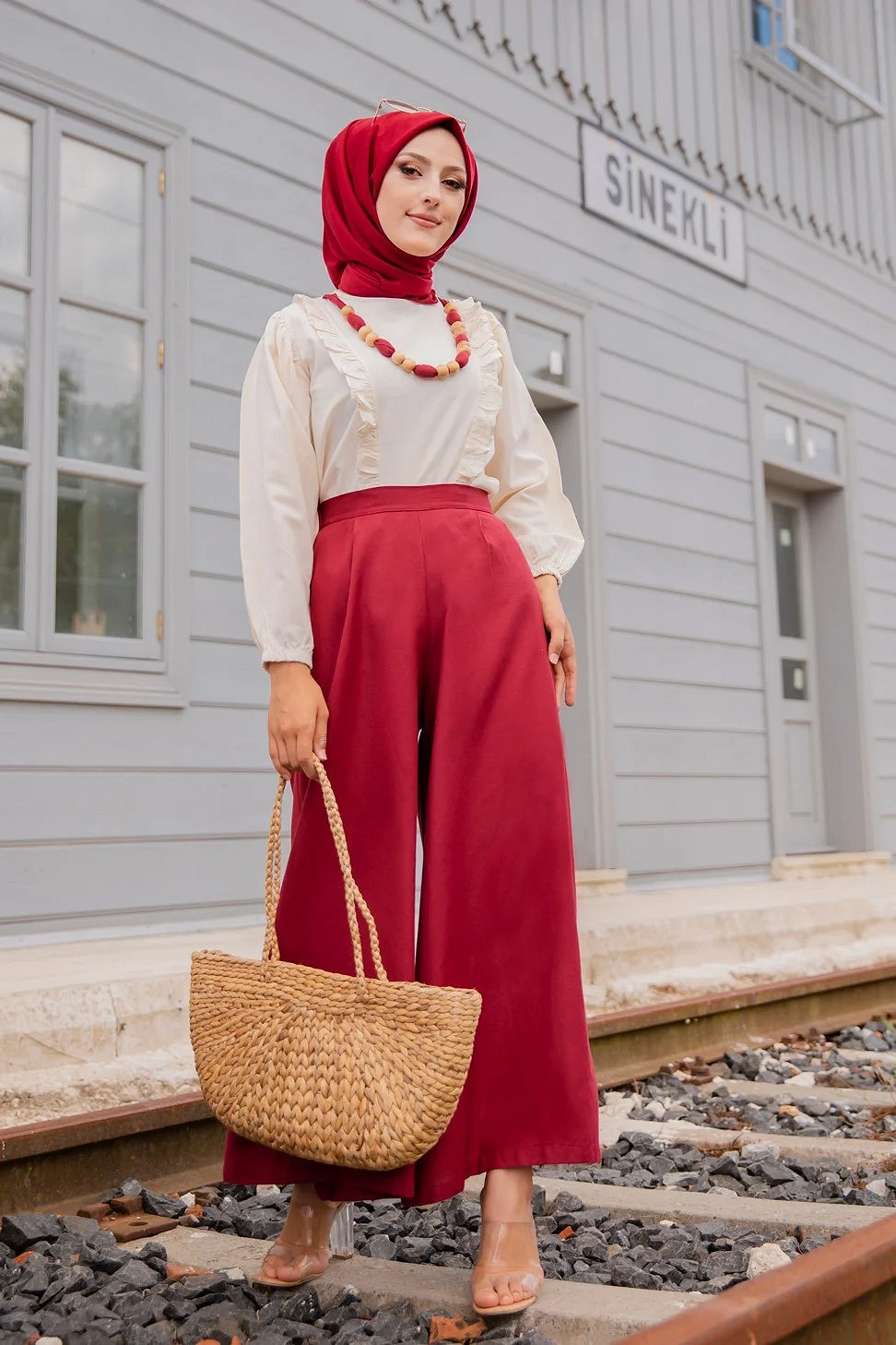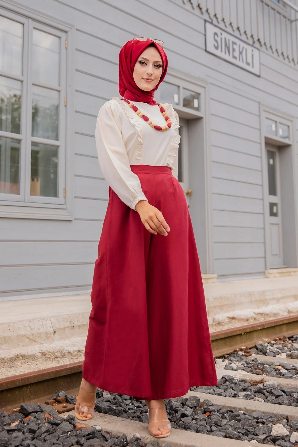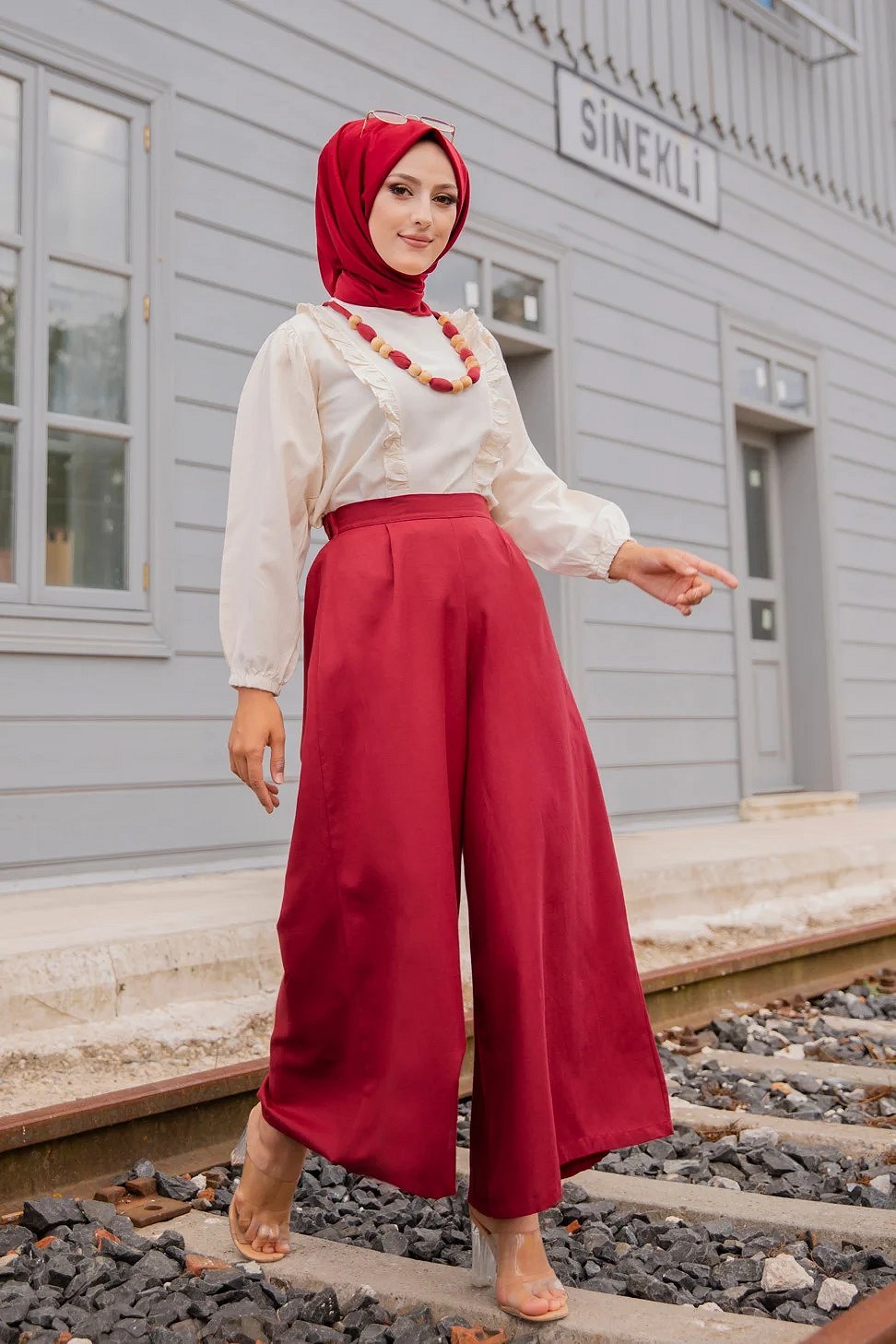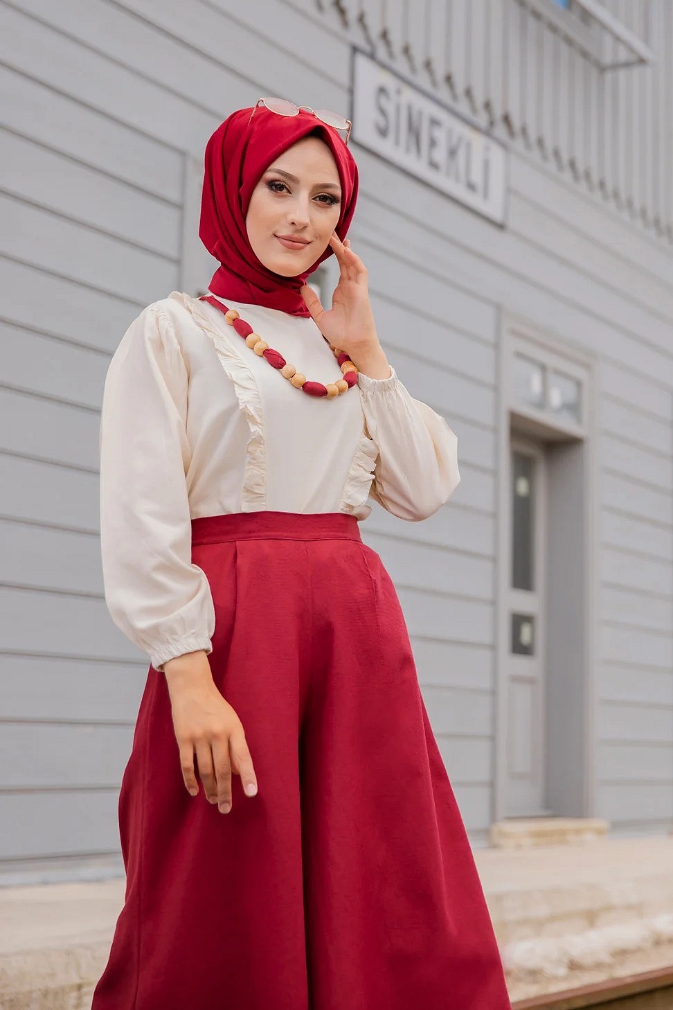 Ensemble casual : Palazzo ample et Blouse avec collier assorti pour femme (Ensembles Hijab Turque) - Couleur creme et Bordeaux