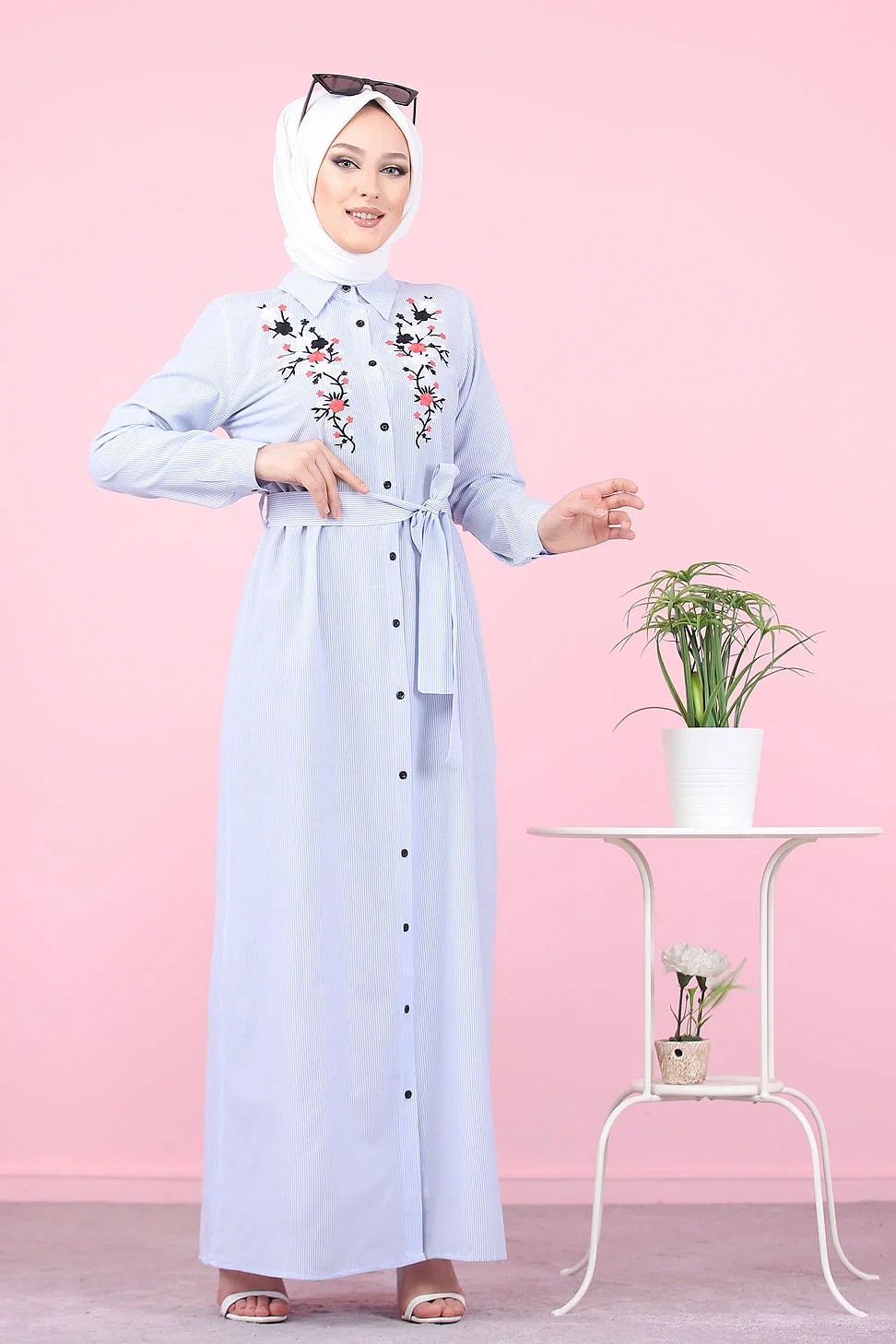 Robe chemise longue a rayures bleues avec ceinture (Vetement hijab femme musulmane)