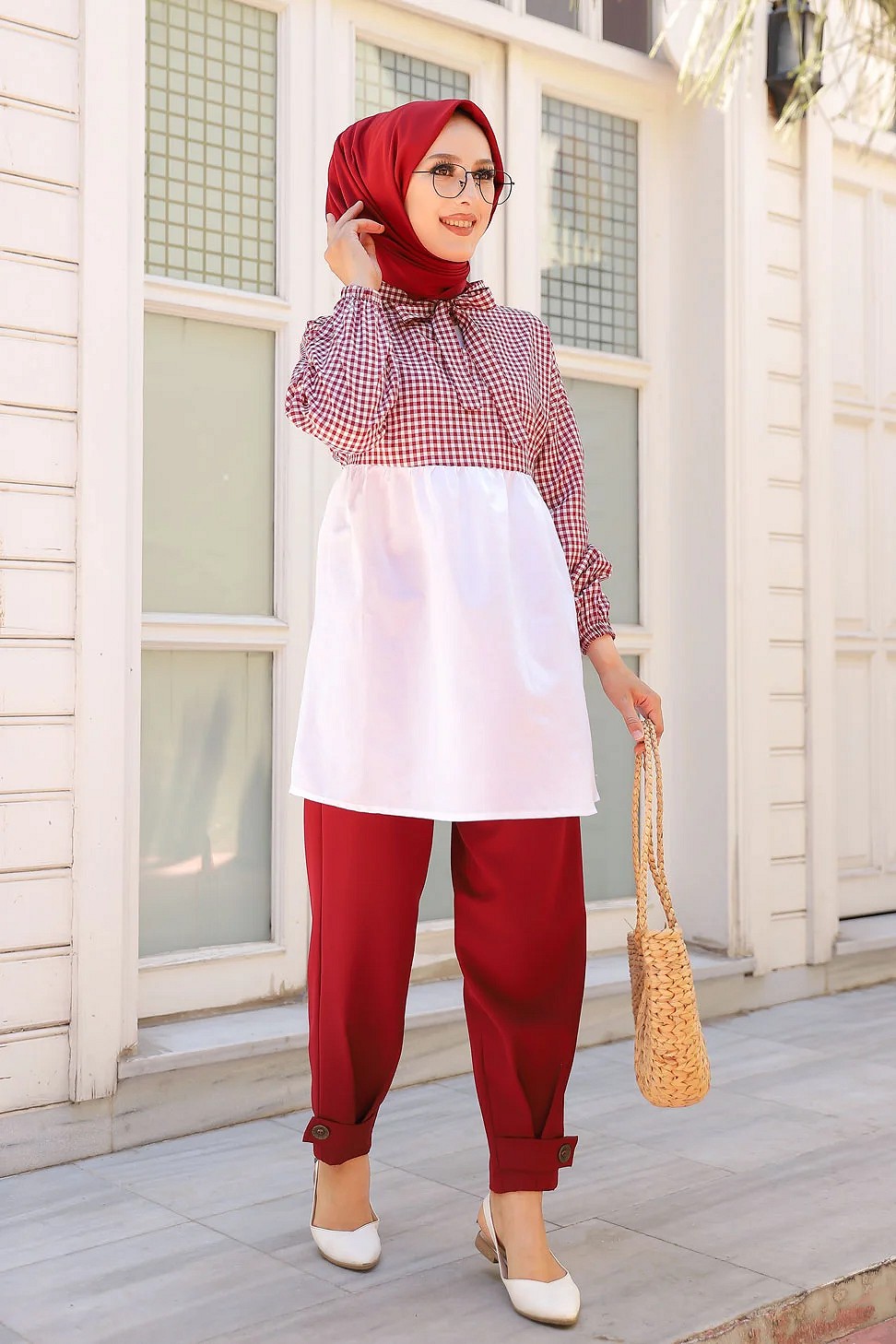 Tunique à carreaux ample et évasée pour femme (Boutique en ligne Hijab et Mode islamique) - Couleur blanc et Bordeaux Vetement & Accessoire