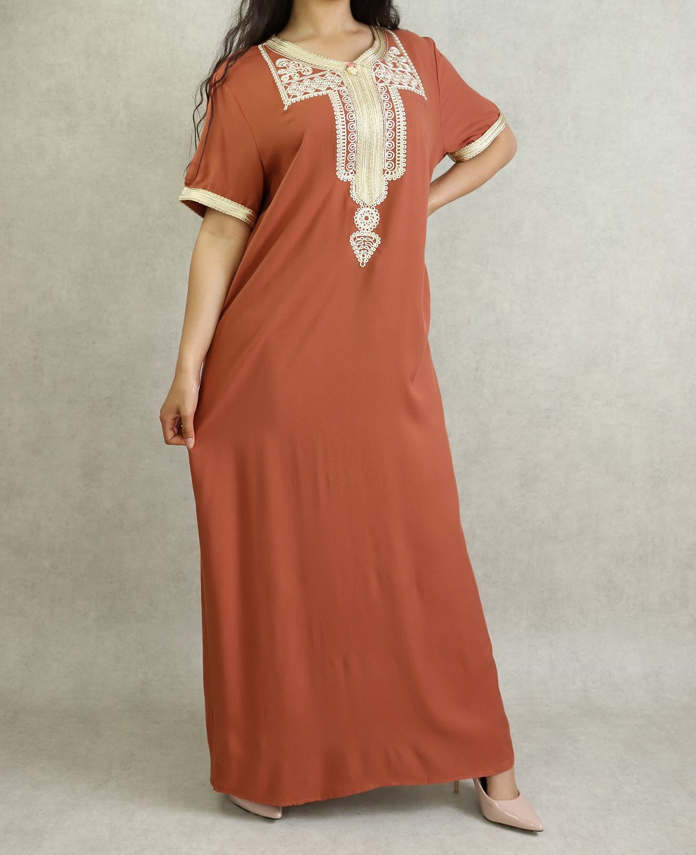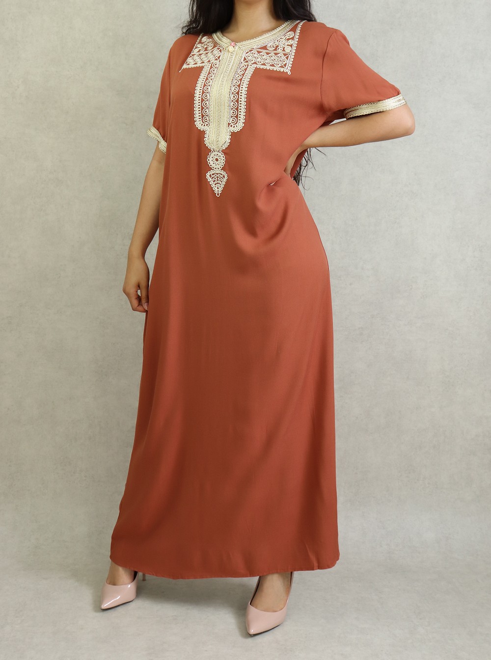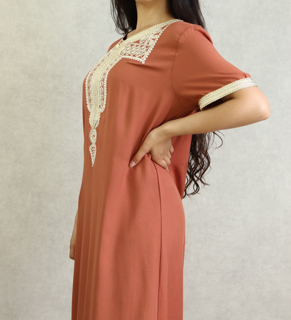 Robe marocaine d'été manches courtes avec broderies - Couleur rouille Vetement & Accessoire