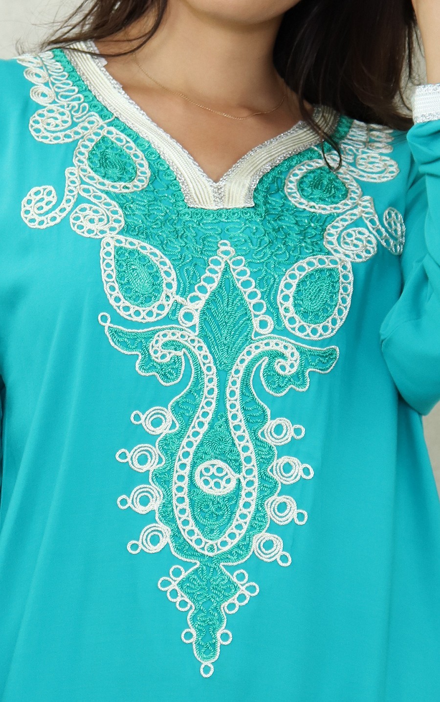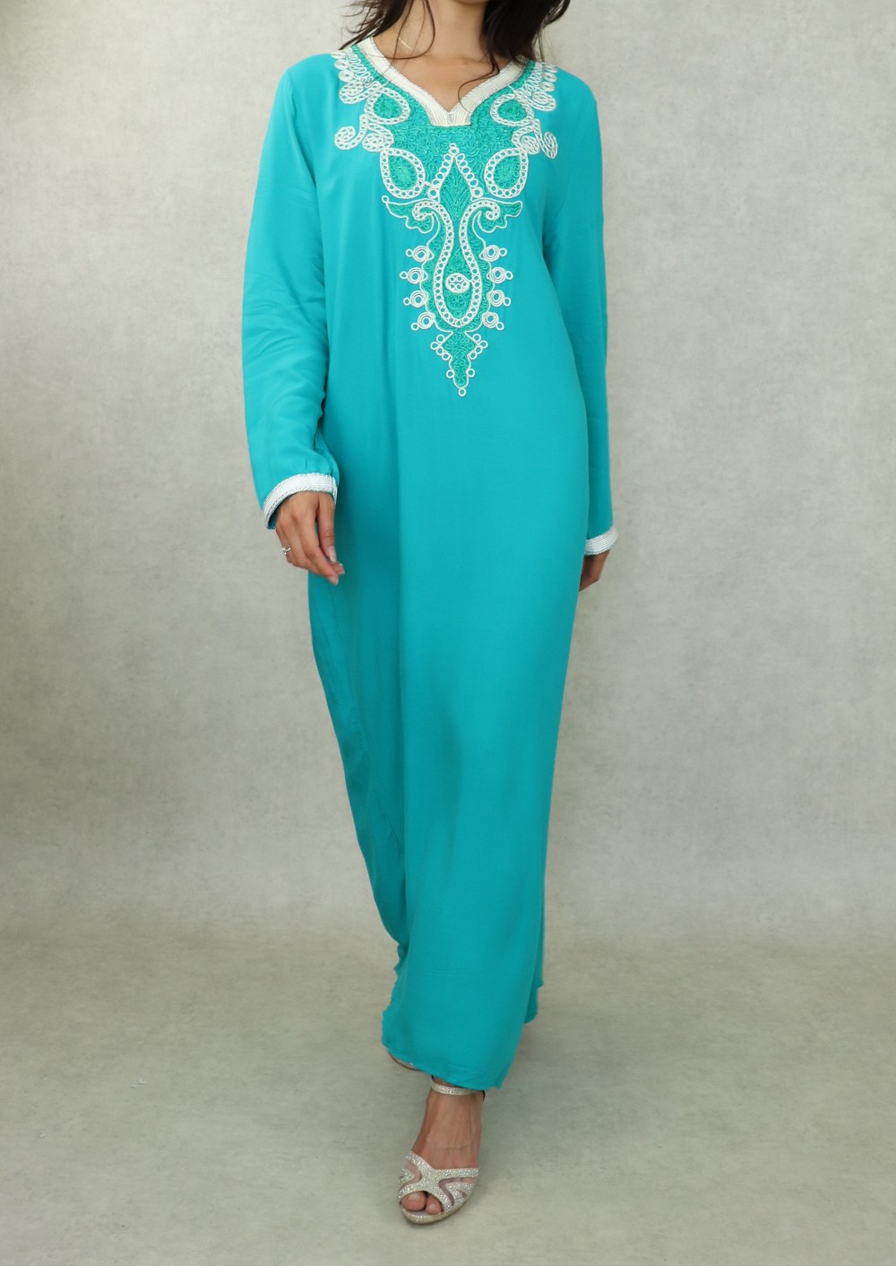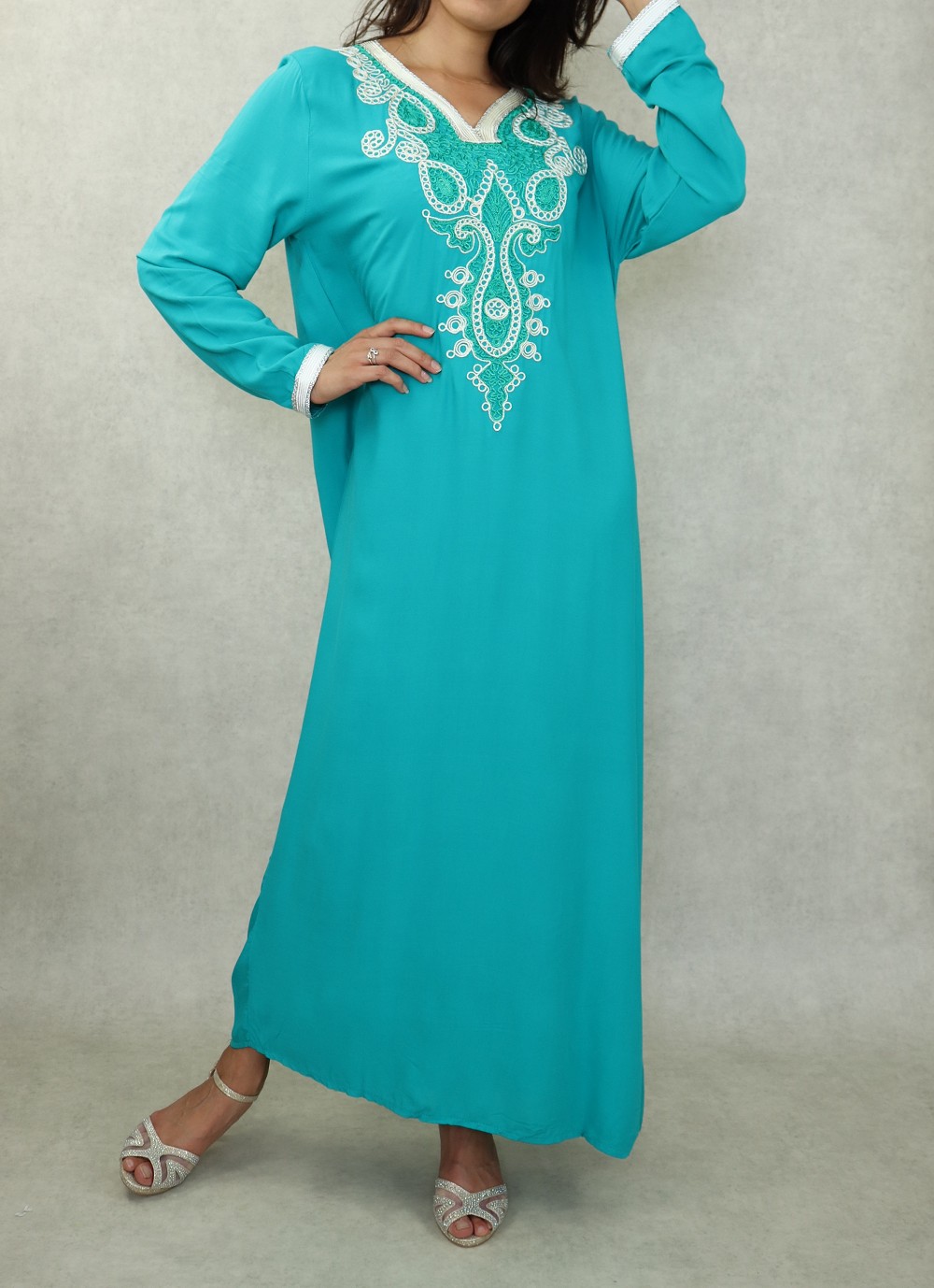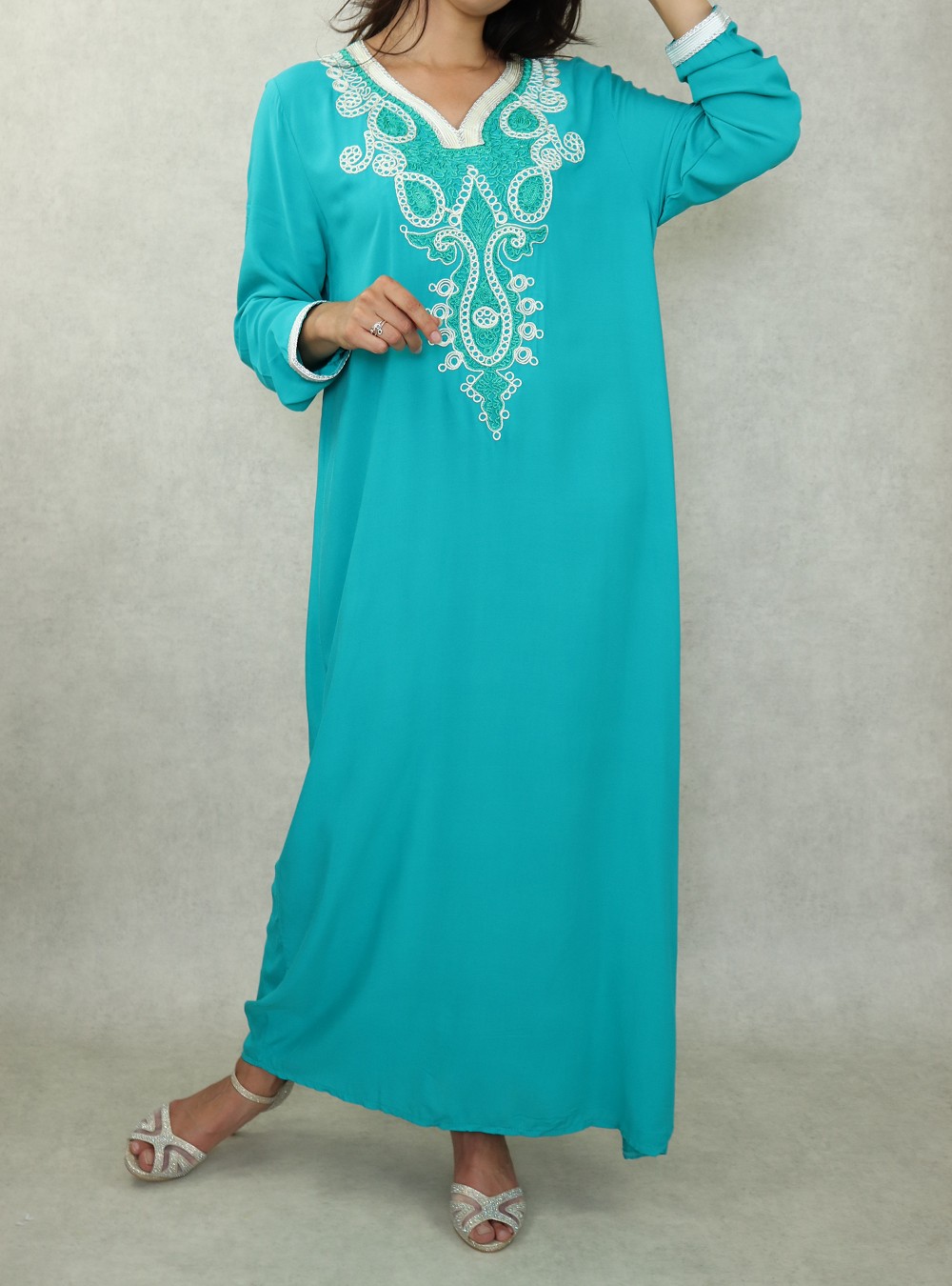 Robe longue, col en V, manches longues décorées de broderies aux poignets ainsi que sur tout le buste. Coupe droite, tissu doux et fluide