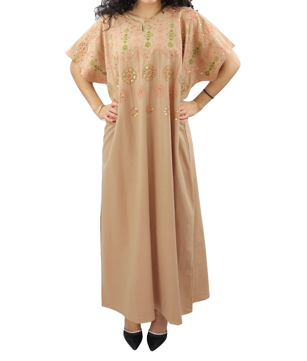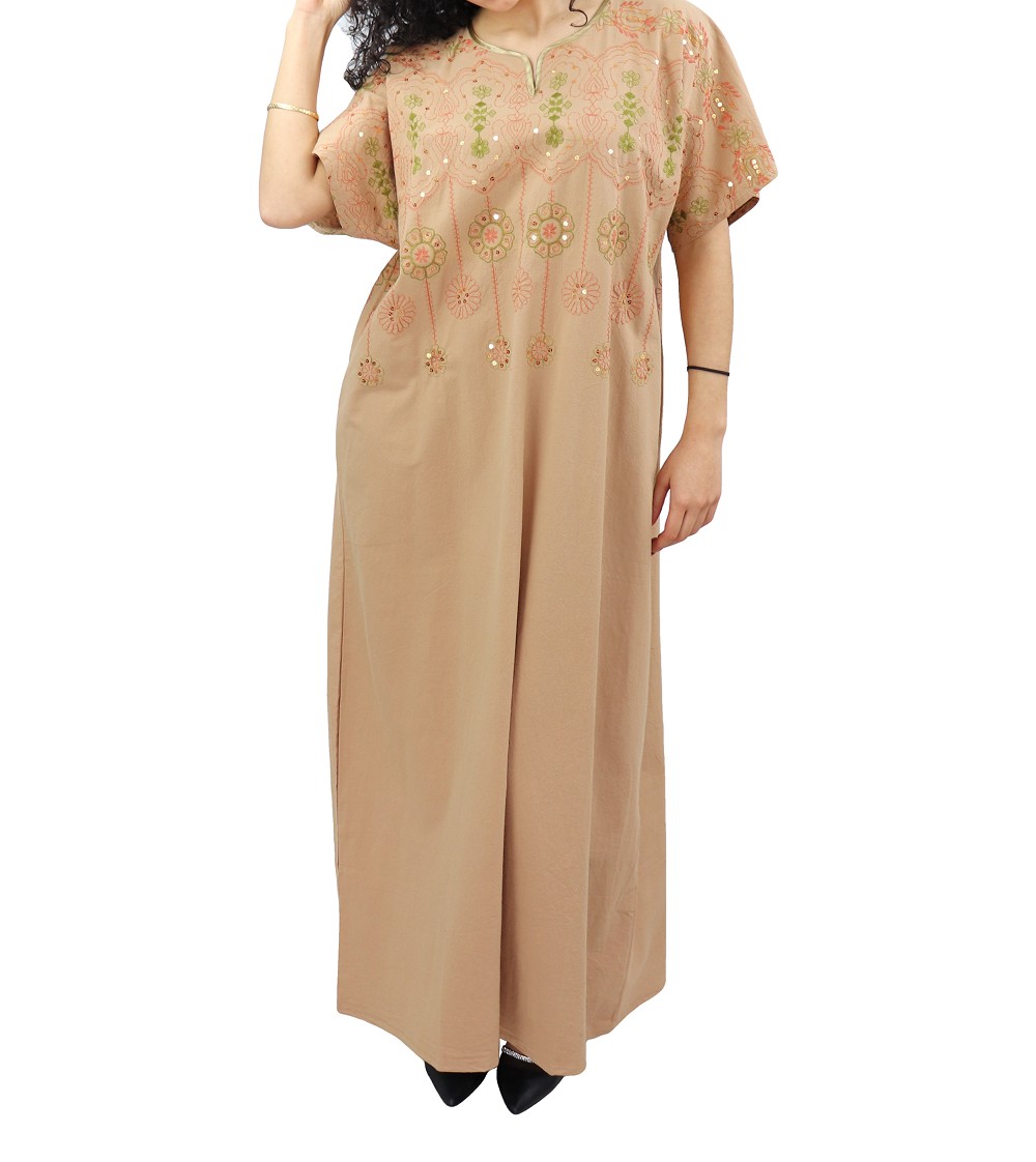 Robe d'intérieur agréable à porter avec broderies en plusieurs couleurs et paillettes sur le devant et le dos. Tissu doux très agréable à porter. Manches courtes.