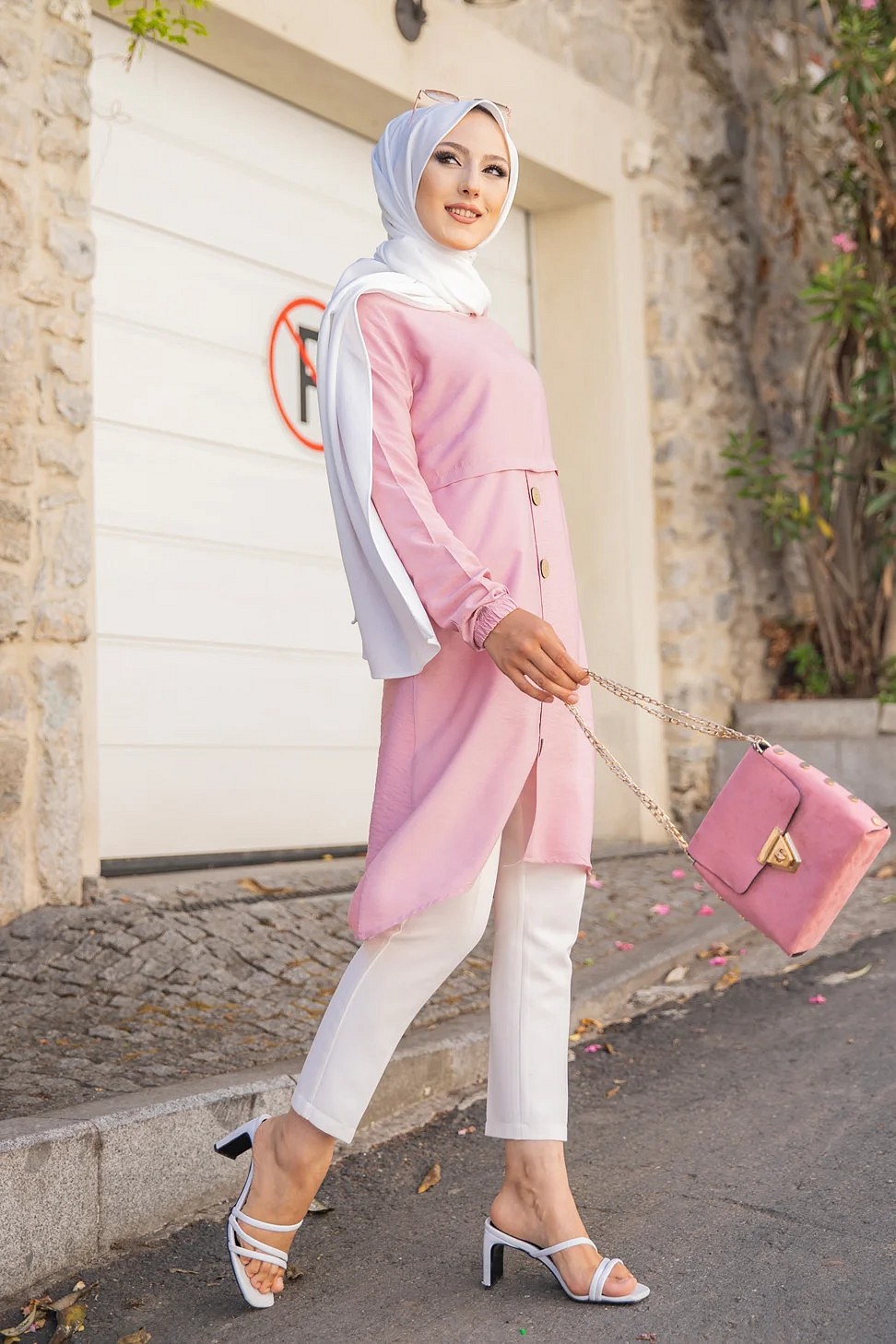 Tunique ample evasee boutonnee pour femme (Modest Fashion) - Couleur rose