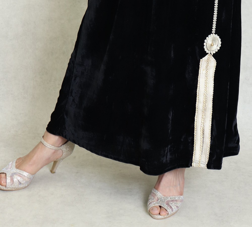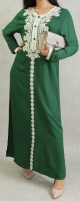 Belle robe en velours style oriental à manches longues avec broderies de qualité sur l'encolure et toute la longueur. Tenue sobre et élégante, parfaite pour occasions et événements.