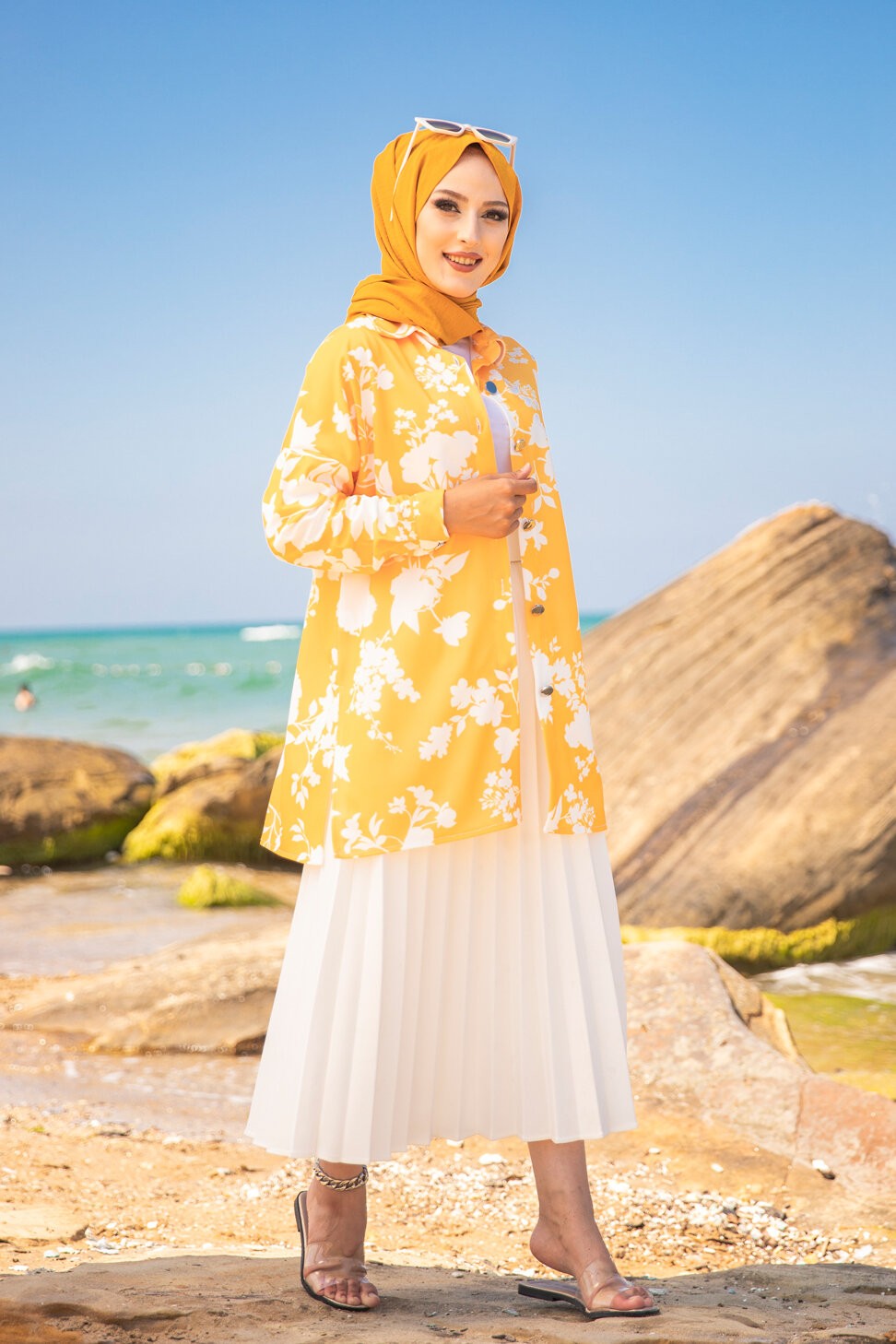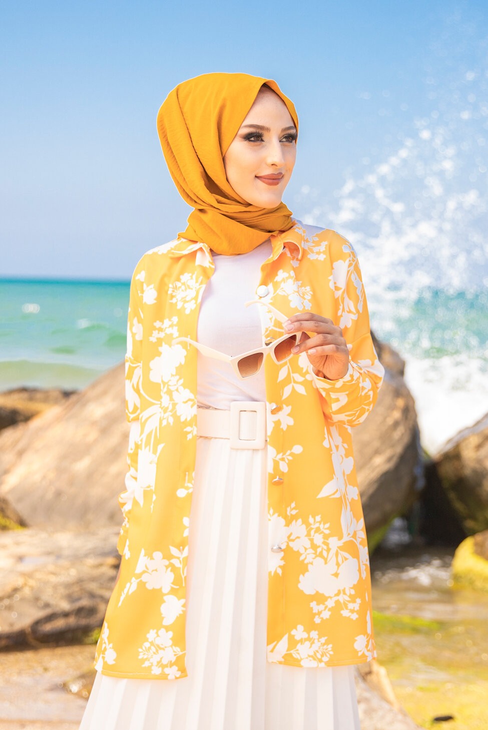Chemise fleurie, manches finition boutons, coupe droite, tissu effet crêpe.