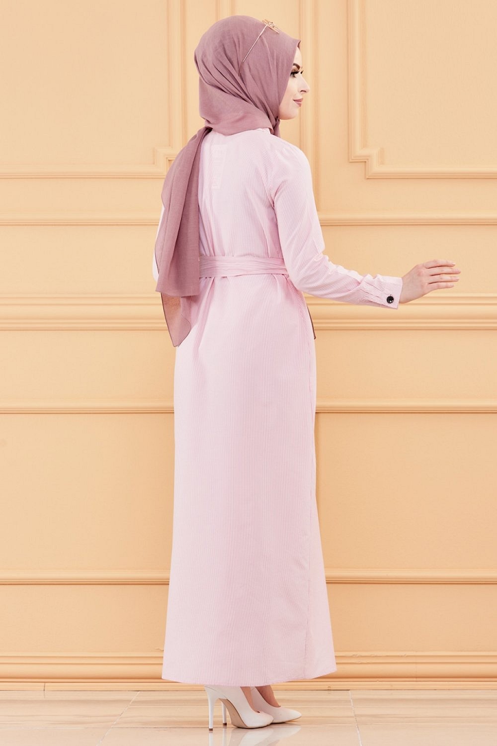 Robe longue boutonnee avec broderies et ceinture assortie (Vetements Modest Fashion pour femmes voilees)- Rayures Couleur rose