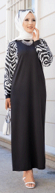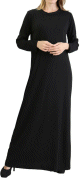 Robe longue col rond, lien de serrage à la taille, coupe droite.
