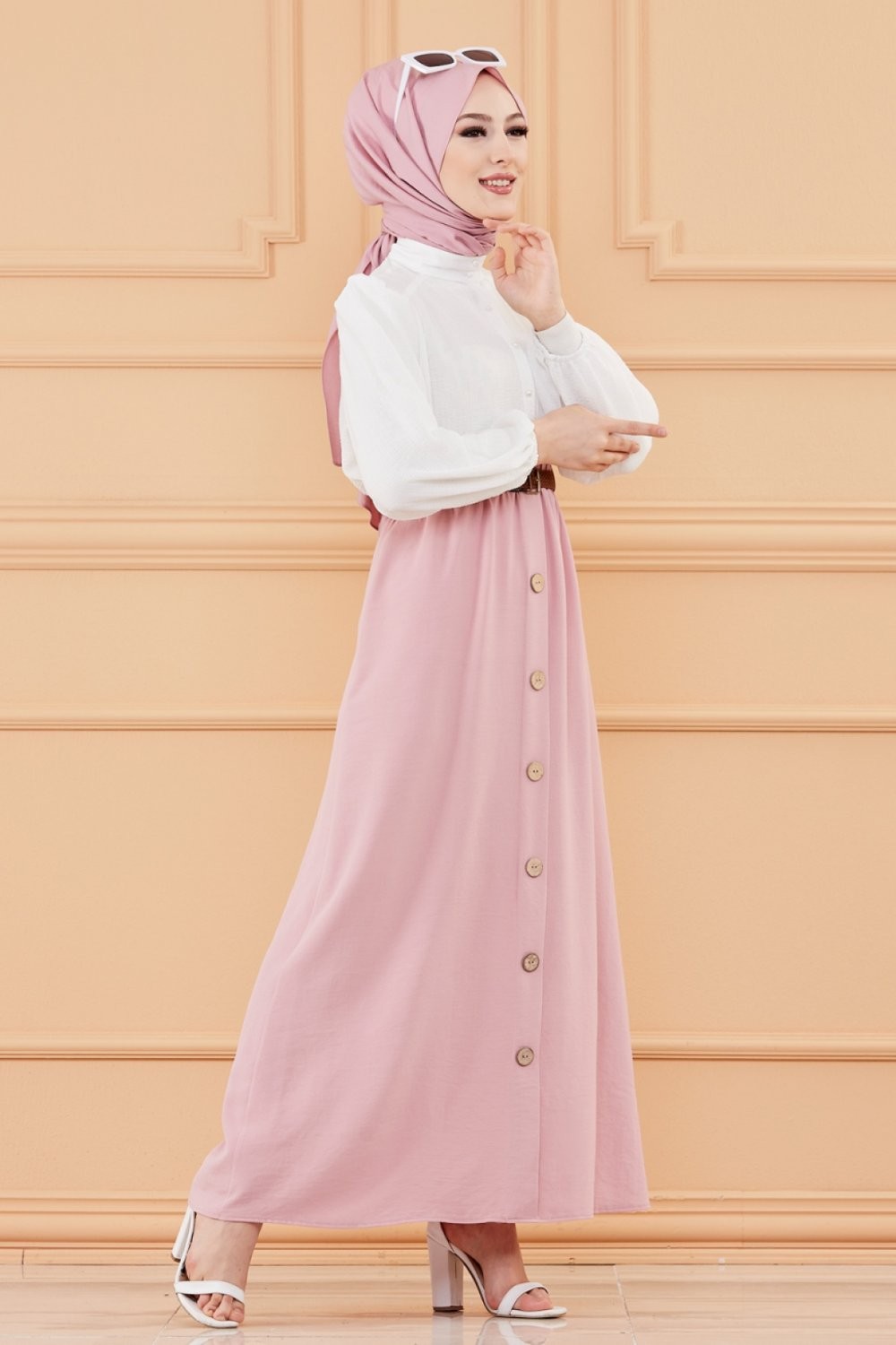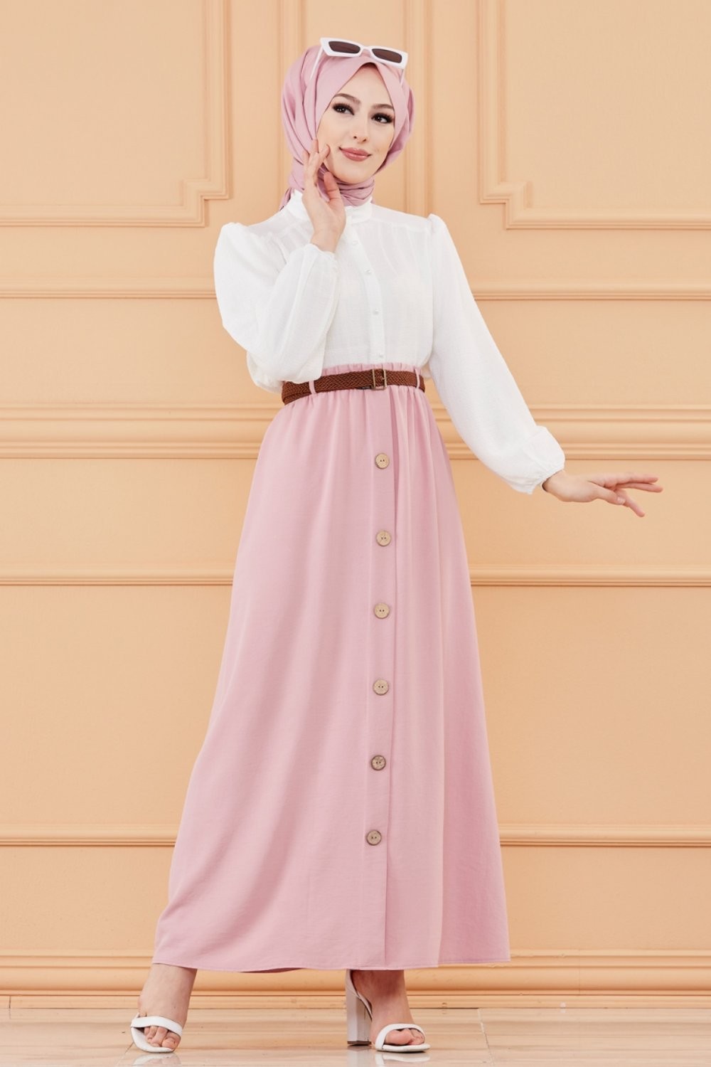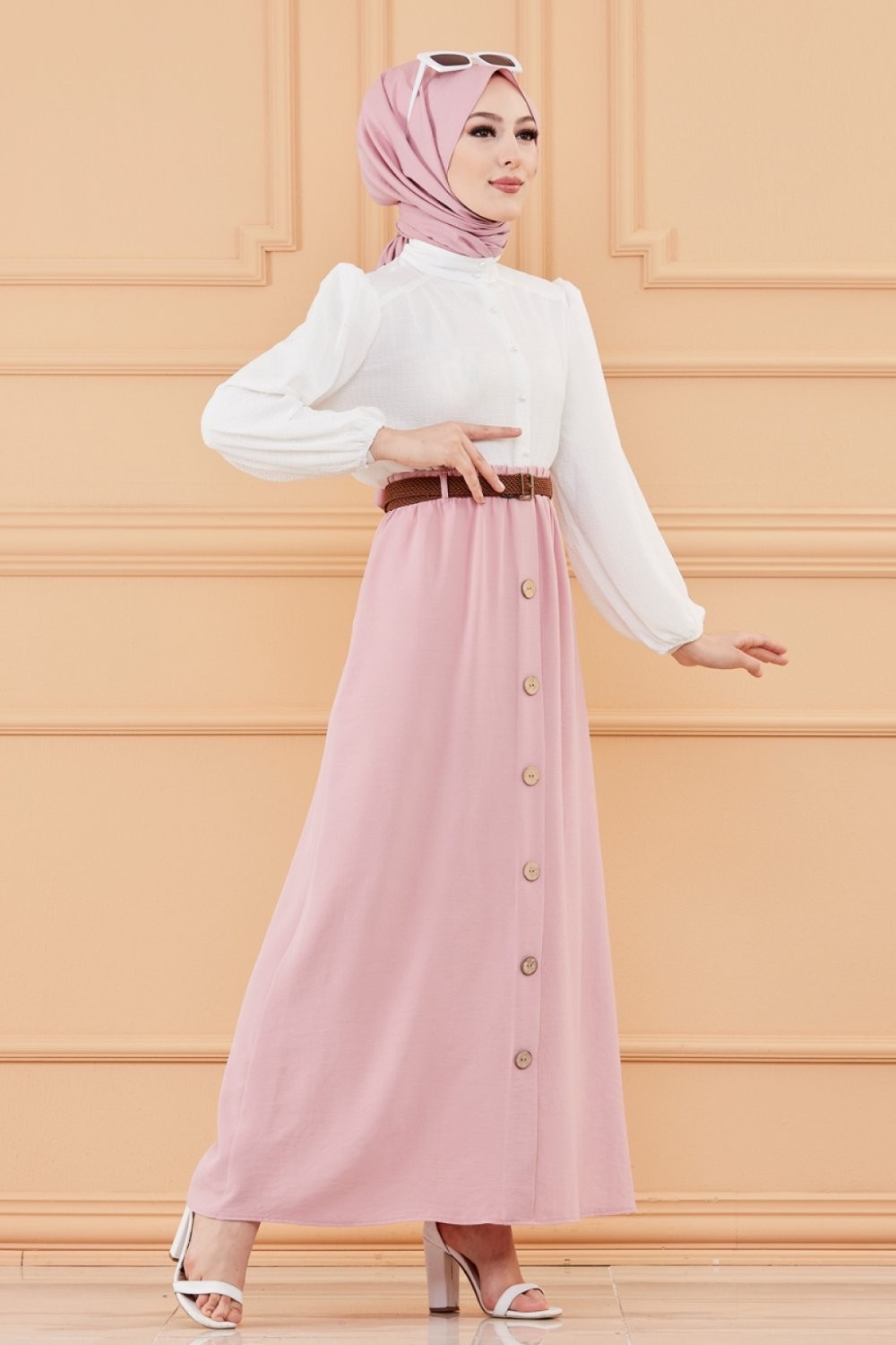 Jupe longue decoree de boutons (Vetement hijab) - Couleur rose poudre