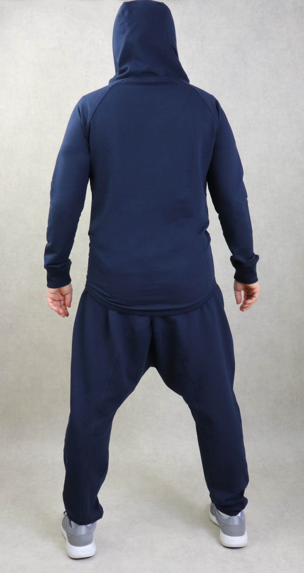 Veste couleur bleu marine, plus longue à l'arrière qu'à l'avant avec bandes blanche et inscription BEST UMMAH. Tissu léger coton strech de qualité et doux. Deux poches sur les côtés. Capuche doublée avec cordon.