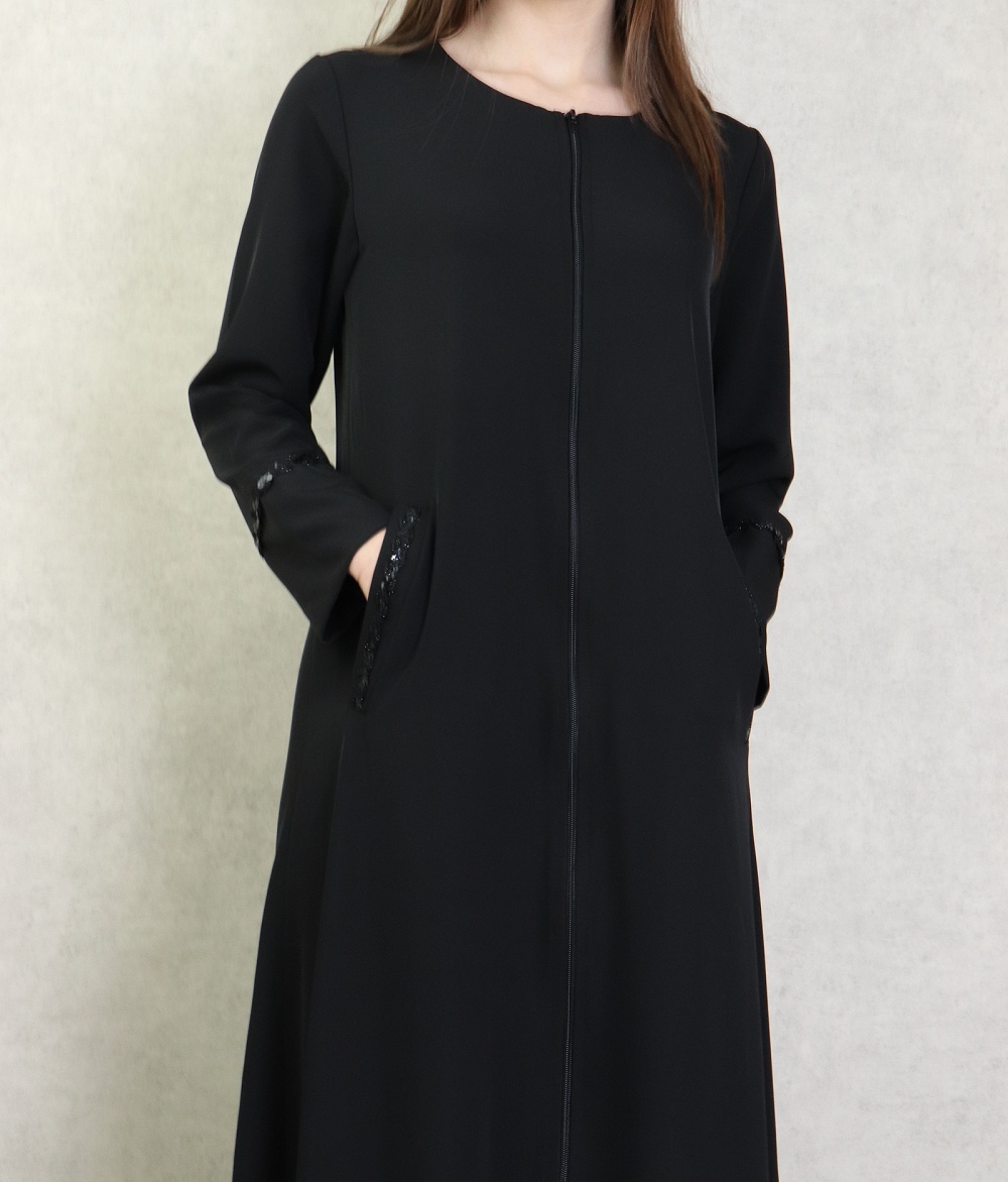 Belle Robe Abaya ouverte sur tout le devant avec fermeture zip. Sobre et évasée avec col rond. Deux poches décorée d'une fine broderie noir et ainsi que sur les manches. Beau tombé et très agréable à porter. Légèrement ouverte en bas... S'enfile rapidement sur d'autres vêtements ou un chemisier.