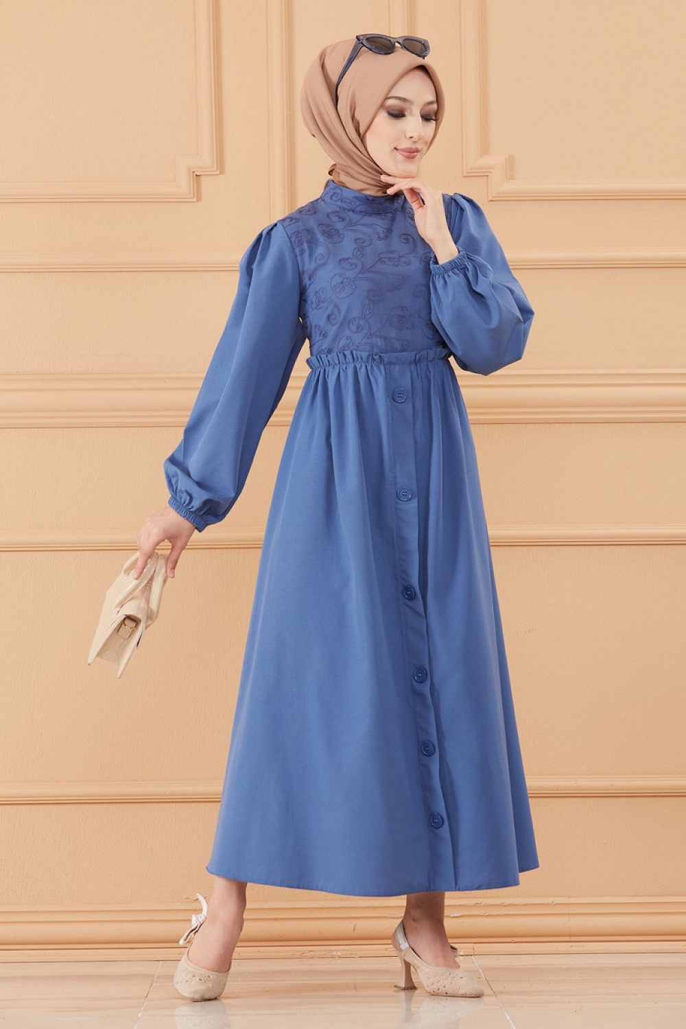 Robe en coton ample style évasé avec broderie discrète pour femme (Vêtement habillé pour hijab) - Couleur bleu indigo Vetement & Accessoire