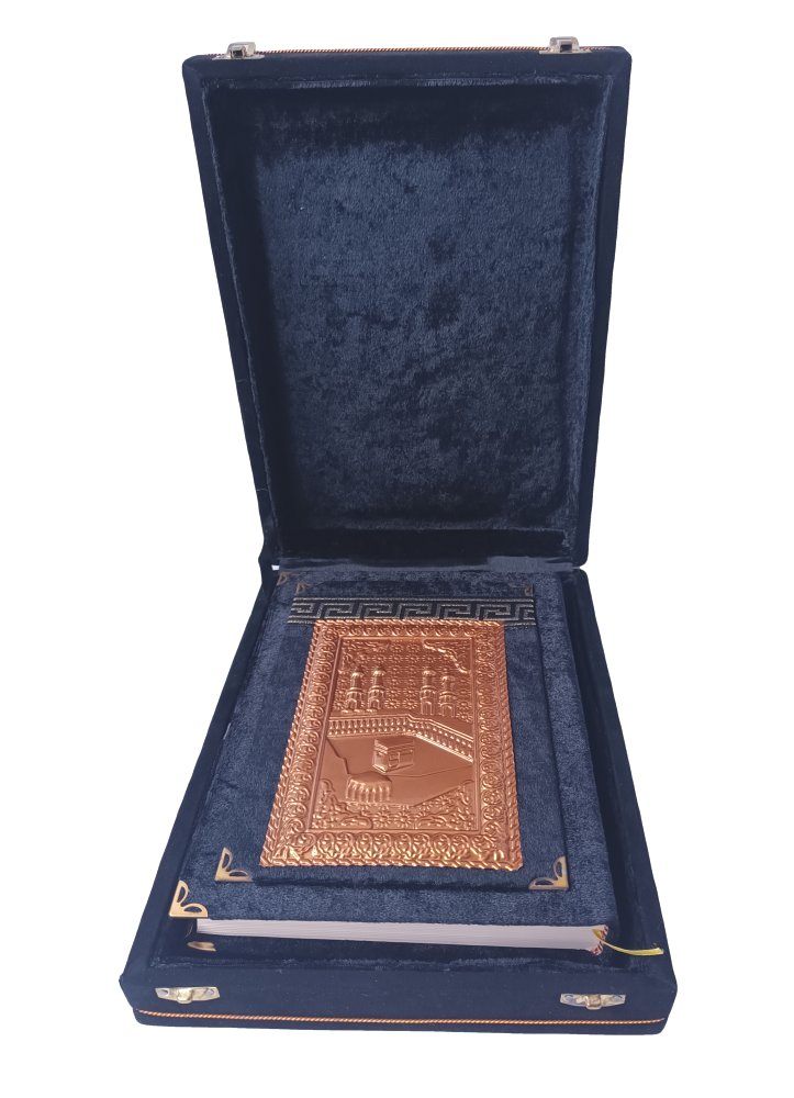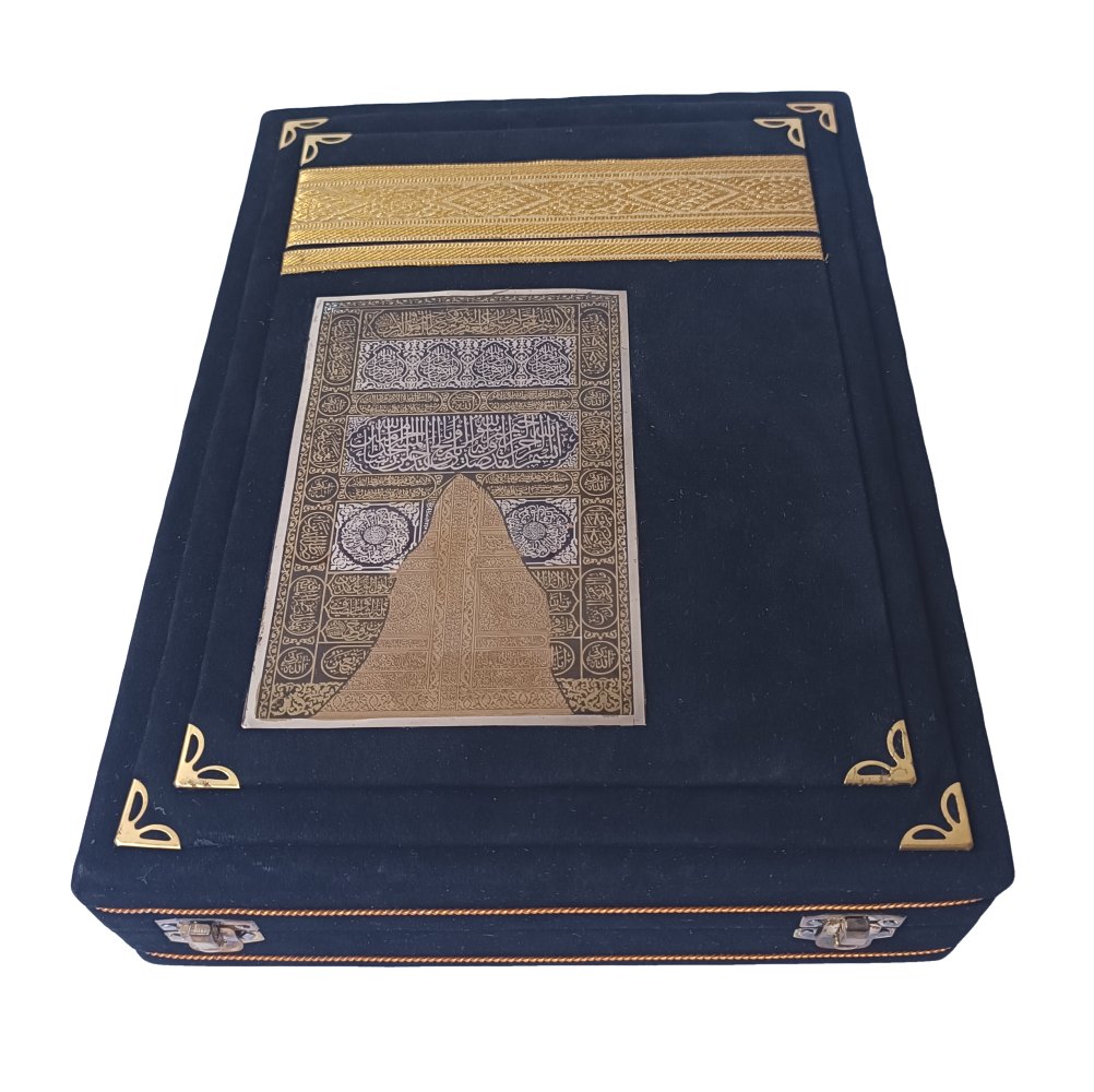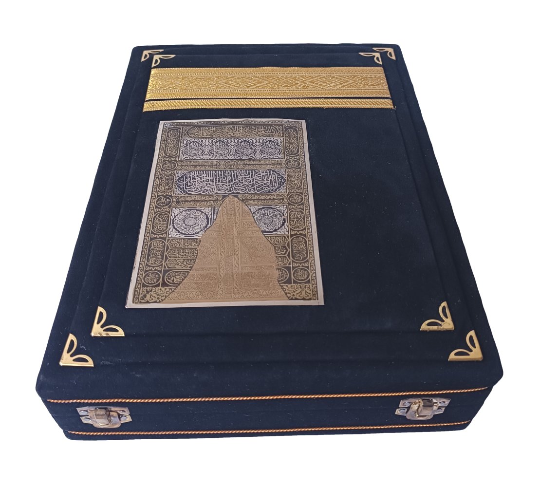 Recevez ce Coffret artisanal décoratif sous forme de Kaaba avec son Coran assorti (recouvert de velours). Le Coran assorti est en langue arabe, il a son emplacement à l'intérieur ou peut être mis en présentation comme sur la photo.