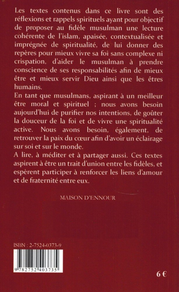 Les textes contenus dans ce livre sont des réflexions et rappels spirituels ayant pour objectif de proposer au fidèle musulman une lecture cohérente de l’islam, apaisée, contextualisée et imprégnée de spiritualité, de lui donner des repères pour mieux vivre sa foi sans complexe ni crispation, d’aider le musulman à prendre conscience de ses responsabilités afin de mieux être et mieux servir Dieu ainsi que les êtres humains.