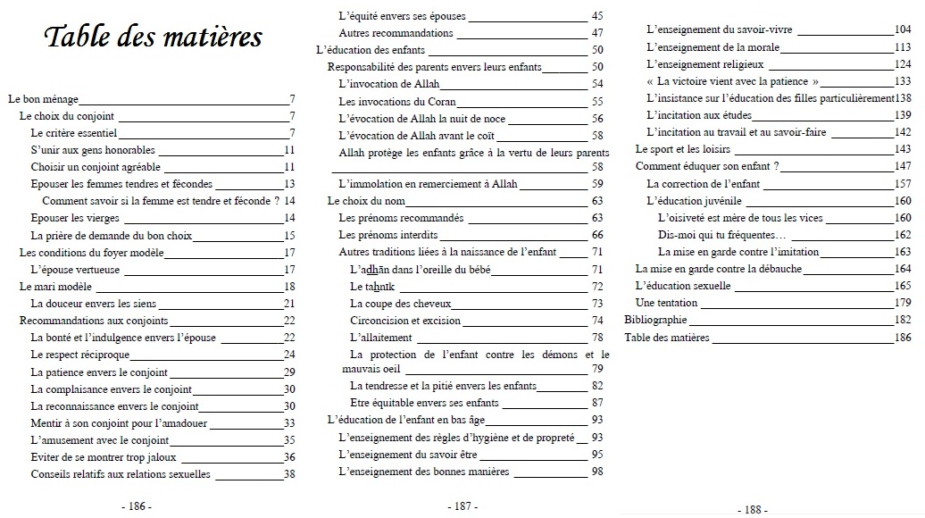 Ce livre se compose de deux volets étroitement liés : le premier, est consacré aux conditions et recommandations qui favorisent la bonne entente au sein du couple musulman et le second évoque les fruits de cette entente.