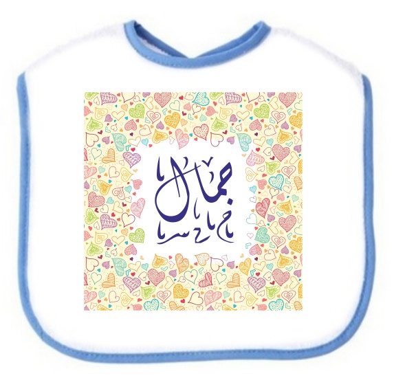 Bavoir pour bébé avec prénom personnalisé en arabe et/ou français inscrit au milieu d'un carré de cœurs multicolores. Excellente idée cadeau pour une naissance.