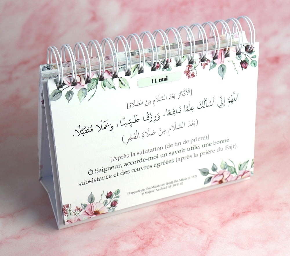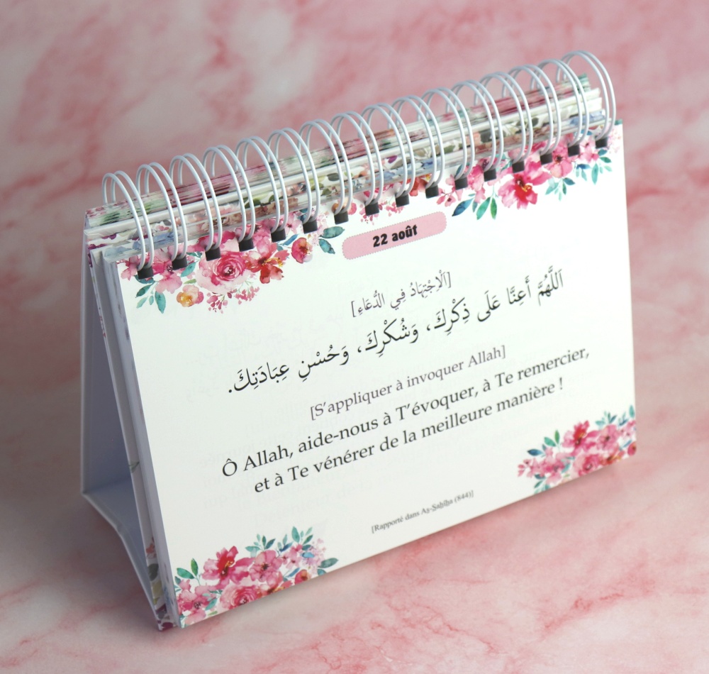 Une invocation chaque jour est un magnifique calendrier – perpétuel, joliment illustré à motif floral, dont les cadres raffinés défilent au fil des mois - qui, comme son nom l’indique, comprend 365 invocations tirées du Coran (dont les 40 Rabbanâ), de la Sunna prophétique authentique, et énumère les 99 beaux noms d’Allah par lesquels il sied à tout un chacun de prier le Très-Haut dans l’espoir d’être exaucé, de même que l’invocation de clôture de récitation du Coran que certains préconisent. Chaque invocation - transcrite dans les deux langues : arabe (vocalisé) et français - est rattachée à sa référence sur le Livre divin sacré, ou à ses sources, son ou ses rapporteurs et aux numéros qui lui sont attribués dans les éminents recueils de hadiths.