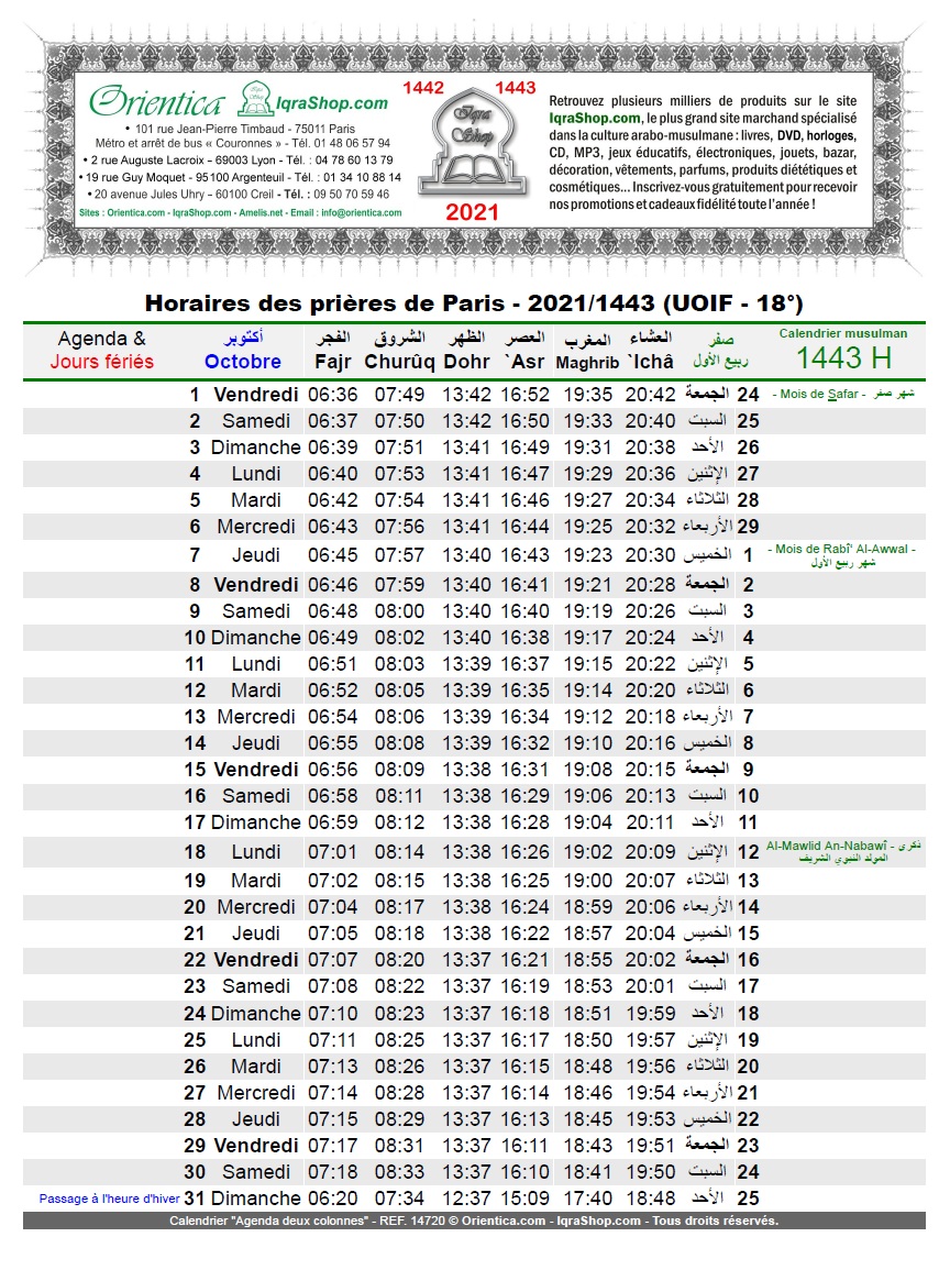 Calendrier islamique des heures de prière année 2026 (1447-1448 H) - "Avec partie Agenda" - Horaires des prières de votre ville (UOIF) - REF. 18092,90 €