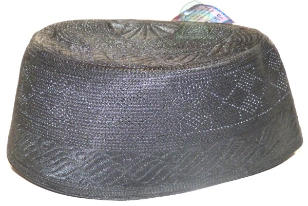 Chachia rigide de couleur noire, avec de discrets motifs brodés, fabriquée au Bangladesh.