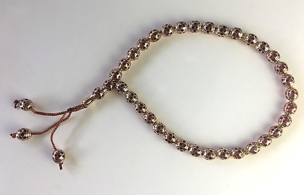 Chapelet (Sebha) à 33 perles de couleur dorées avec motifs. Séparateur toutes les 11 perles.