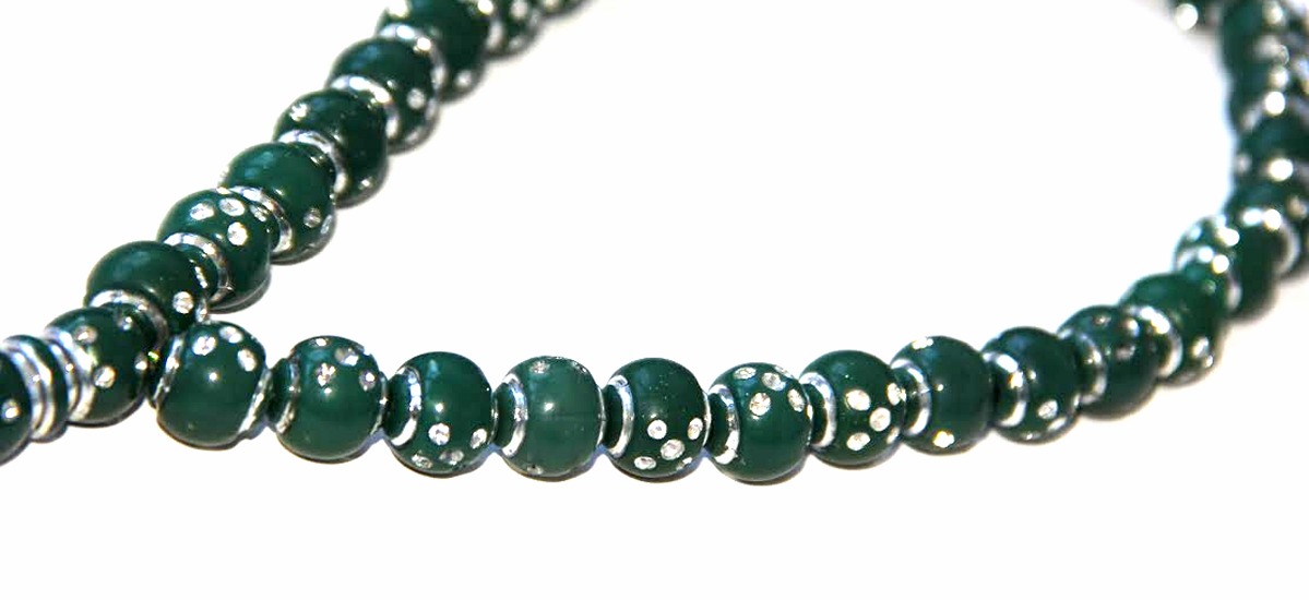 Très joli chapelet de luxe vert foncé avec motifs argentés. Les motifs peuvent varier quelque peut en fonction du stock.
