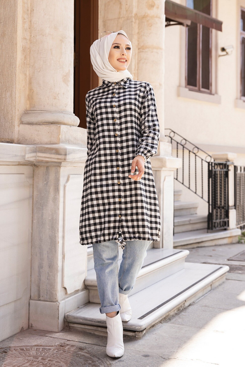 Ce modèle affiche un motif carreaux tendance. Il est idéal pour réchauffer une tenue à la mi-saison.