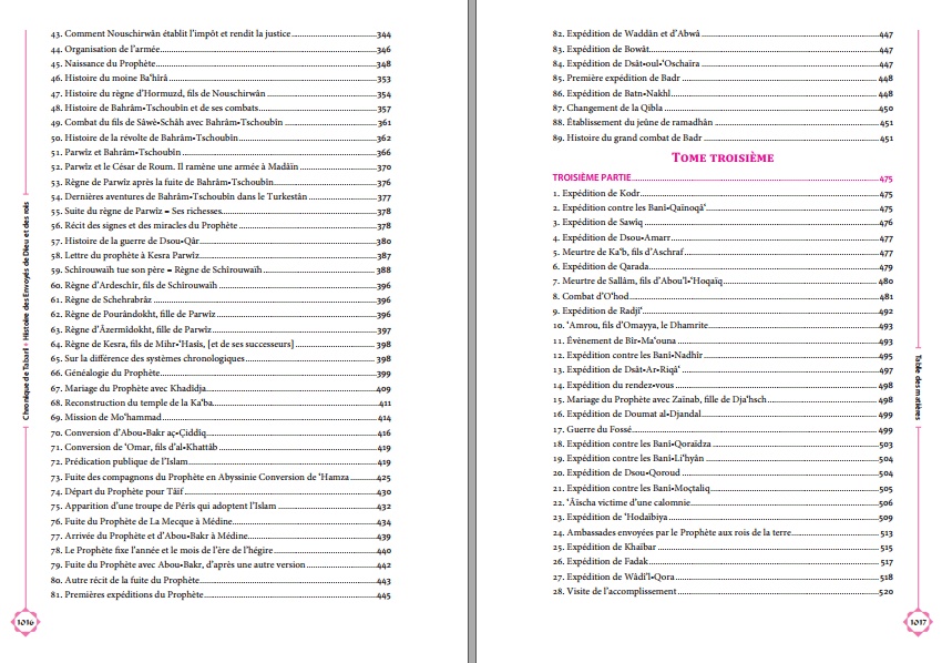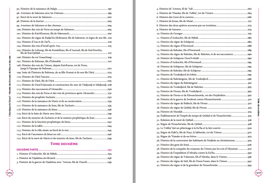 Cette traduction française de l'Abrégé de Tabarî produite par un orientaliste du XIXe siècle et réalisée par Hermann Zotenberg, reste, malgré son ancienneté (1874), un travail de grande valeur. Zotenberg a transmis au lecteur francophone un Tabarî accessible, correspondant aux règles de la rédaction historique du début du XXème siècle, aussi bien dans la chronologie que dans la narration des évènements. Ces règles ne sont pas exclusivement celles de l'école de la transmission du `Hadîth qui a donné naissance à l'historiographie musulmane.