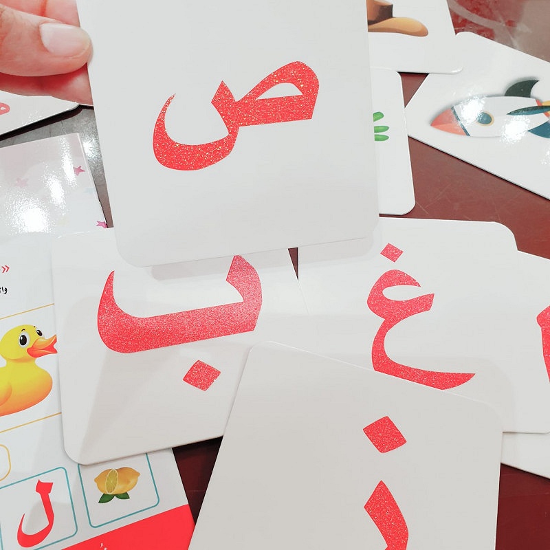 Coffret Montessori spécial "lettres arabes" composé de 84 cartes pour apprendre les lettres et la lecture de manière naturelle.