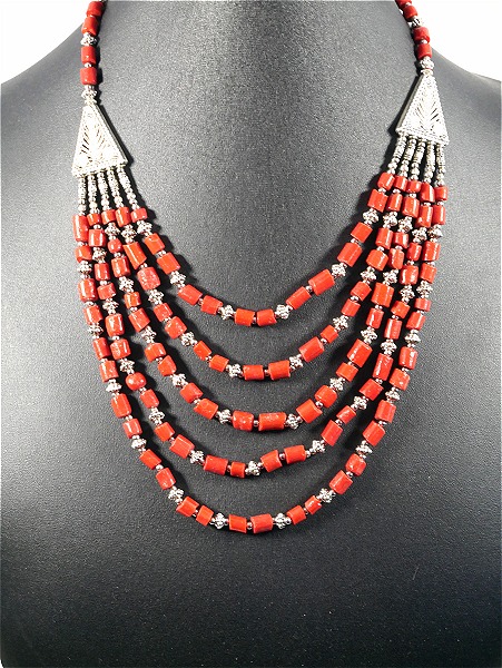 Collier ethnique artisanal imitation pierres de corail séparées de perles en métal et composé de perles rouges - REF. 18945 (14.00 €)