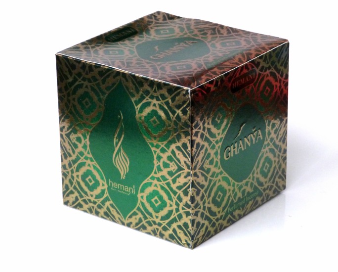 Bakhour (encens) "Ghanya" pour parfumer son intérieur aux senteurs orientales, présenté dans un emballage joliment décoré et fourni avec une cuillère de dosage.