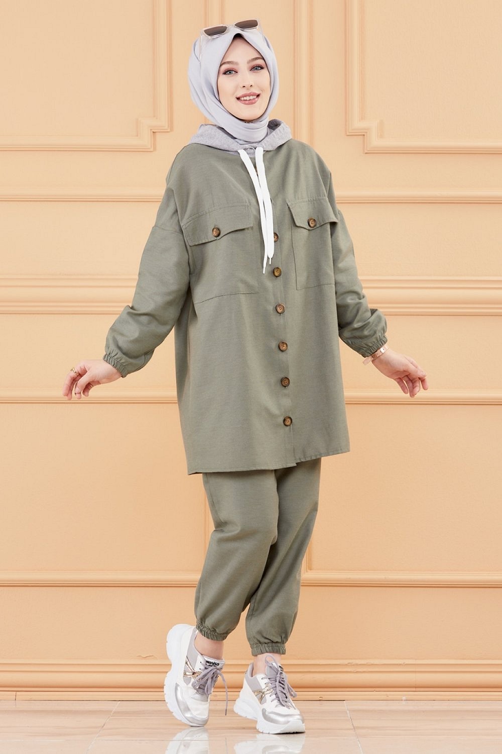Ensemble décontracté pour la vie de tous les jours avec sa veste ample à capuche et son pantalon assorti.