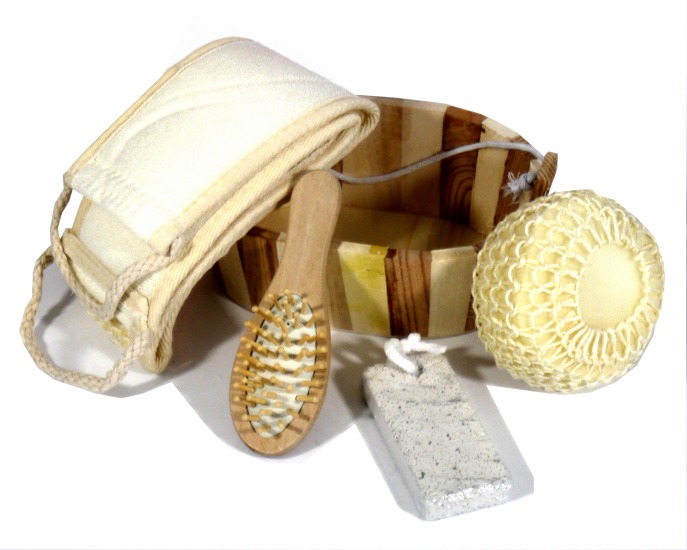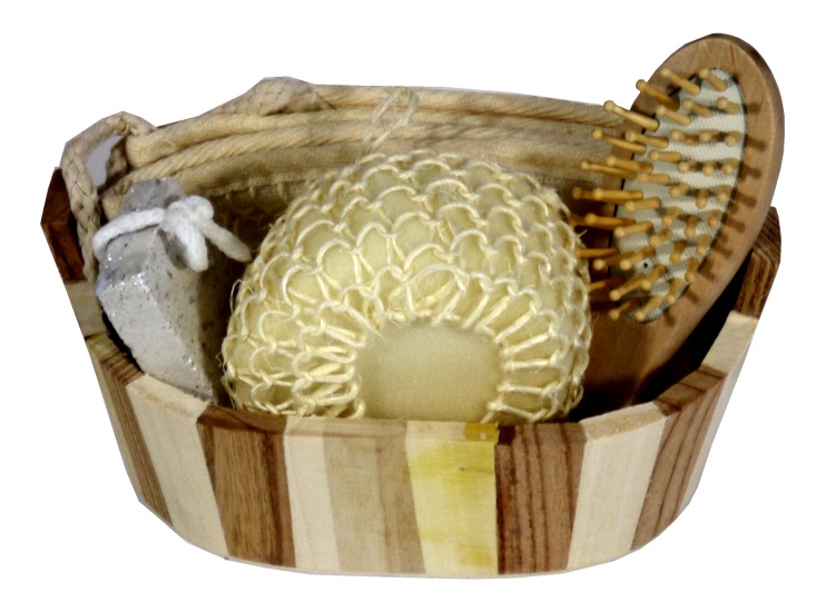Cet ensemble complet pour bain et hammam présenté dans un panier en bois (qui peut servir également de récipient d'eau) vous offre tout le nécessaire pour une toilette parfaite.