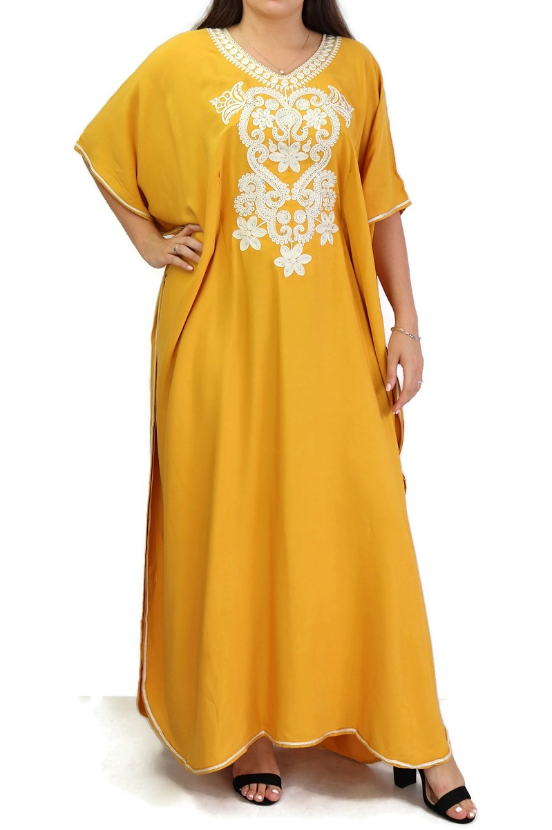Gandoura / Robe marocaine manches courtes avec decorations - Couleur Jaune moutarde - Fabrique au Maroc