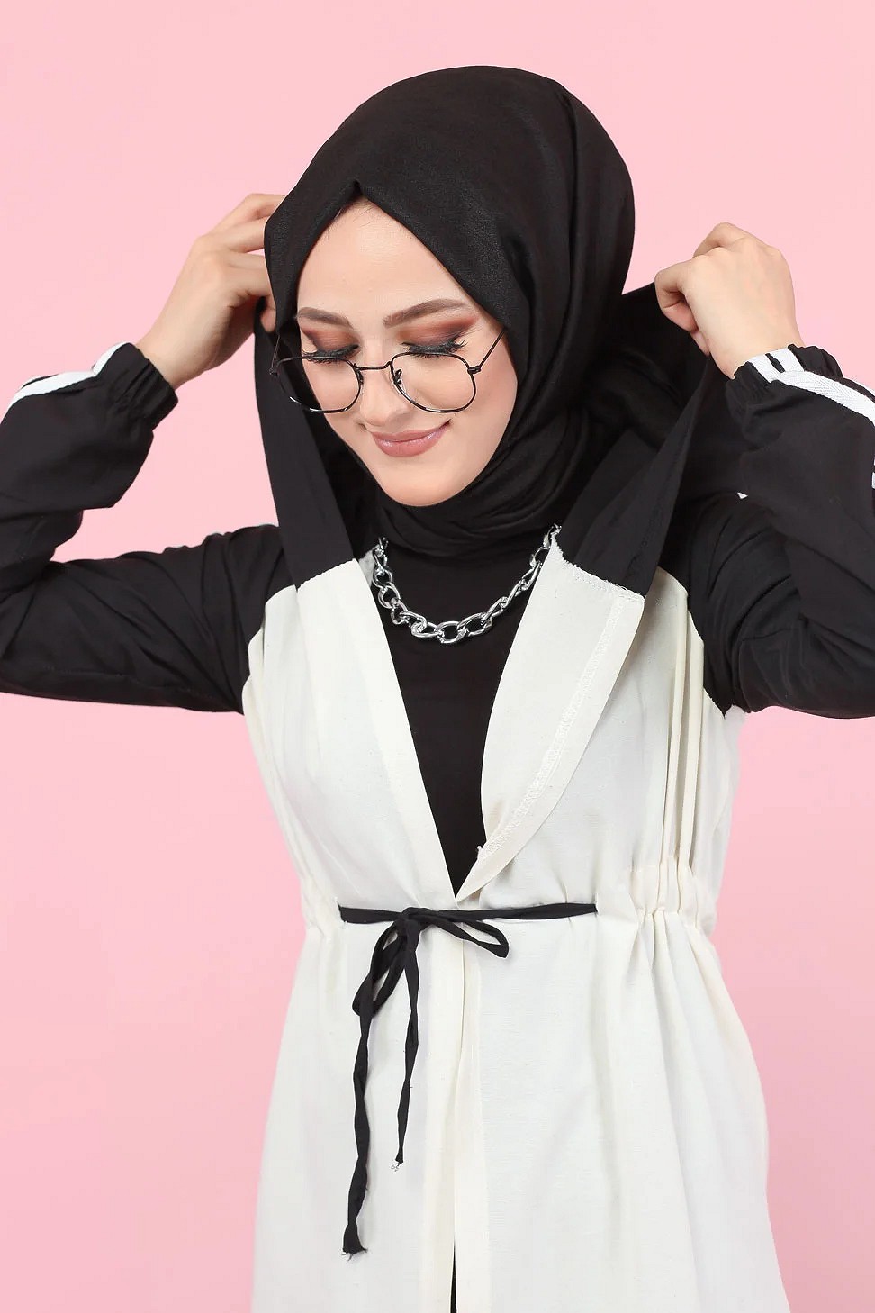 Gilet long bicolore, capuche ample, lien de serrage à la taille. Tissu effet tissé aspect lin.
