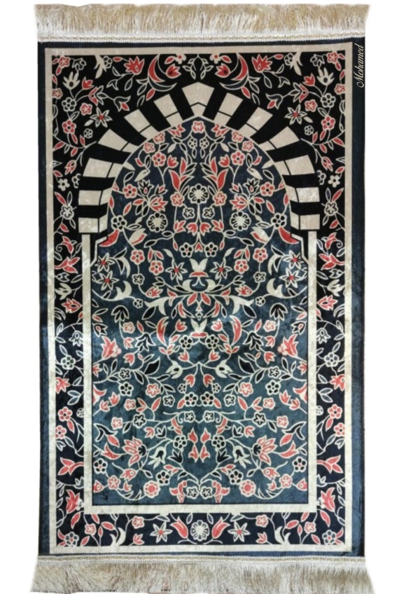 Recevez ce grand tapis de luxe (70 x 115 cm) avec dessous antidérapant. Très doux au toucher avec motif indiquant la direction de la qibla (La Mecque, pour ne pas mélanger les pieds et la tête).