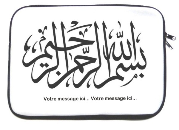 Housse pour PC portable 14 pouces avec message personnalisé et inscription calligraphique "Au Nom d'Allah Le Clément, Le Miséricordieux" (Bismillahi-l-Rahmâni Rahîm). L'autre face est blanche (neutre sans aucune inscription).