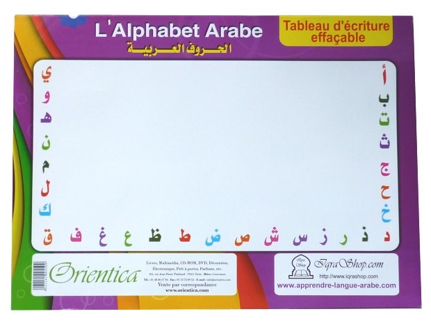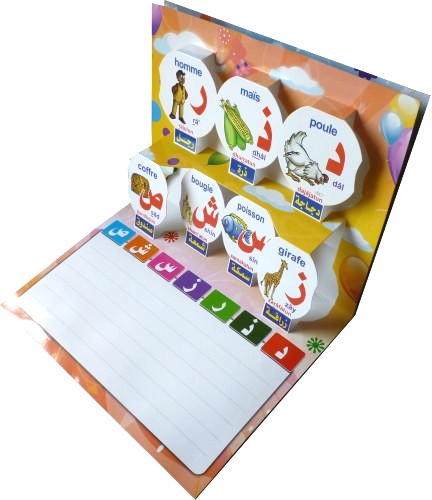 La face arrière de livre fermé contient également une ardoise effaçable qui résume les 28 lettres arabes.