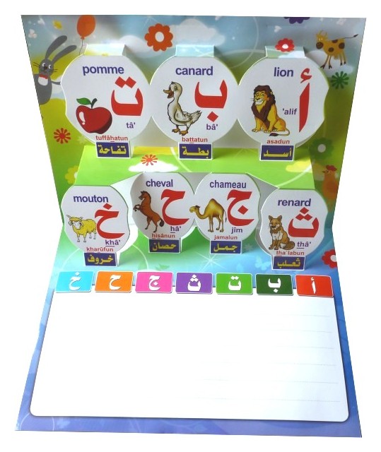 Il permettra à votre enfant de s'initier à la langue arabe. Chaque planche d'écriture reprend 7 nouvelles lettres de l'alphabet arabe avec les images des mots, chaque mot est écrit en arabe, traduit en français et écrit en phonétique... Au total 4 planches avec figurines.