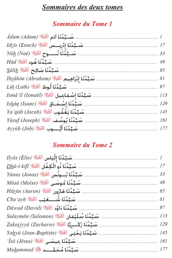 Les Prophètes et Messagers ne sont jamais dessinés (leur présence peut être indiquée parfois par une lumière)... Cet ouvrage en 2 tomes, richement illustré, avec texte bilingue (français et arabe vocalisé) comprend les 24 récits ci-dessous :