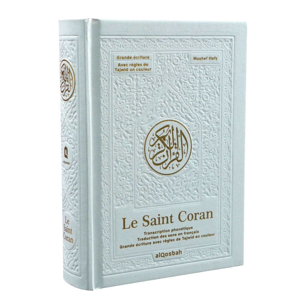 Version avec 1220 pages, grande écriture de l'arabe (grands caractères) et règles de tajwid en couleur. Couverture rigide cuir de luxe blanche dorée. Les trois marques pages (rouge, vert et jaune) vous permet de marquer et de réviser plusieurs sourates ou parties du Coran à la fois.