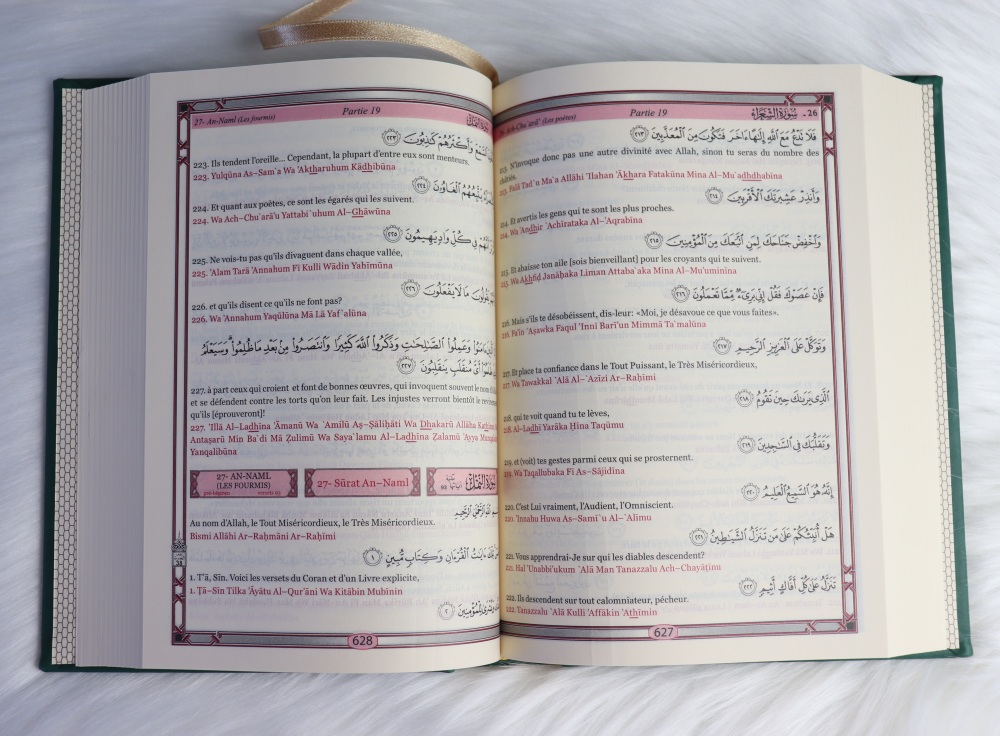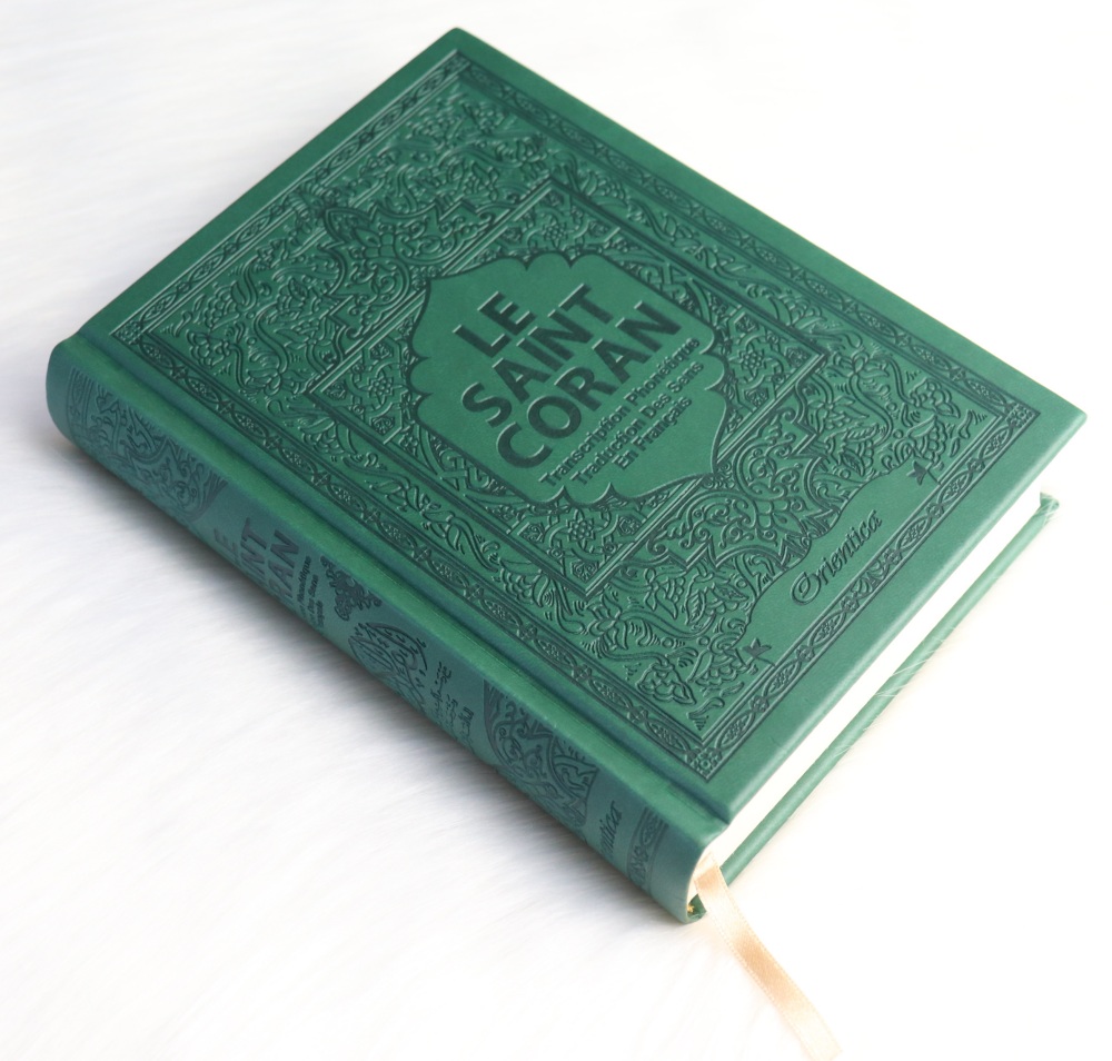 Le saint Coran avec versets en arabe, traduction française + transcription phonétique (translittération de l'arabe en caractères latins). Impression couleur, avec marque page intégré.