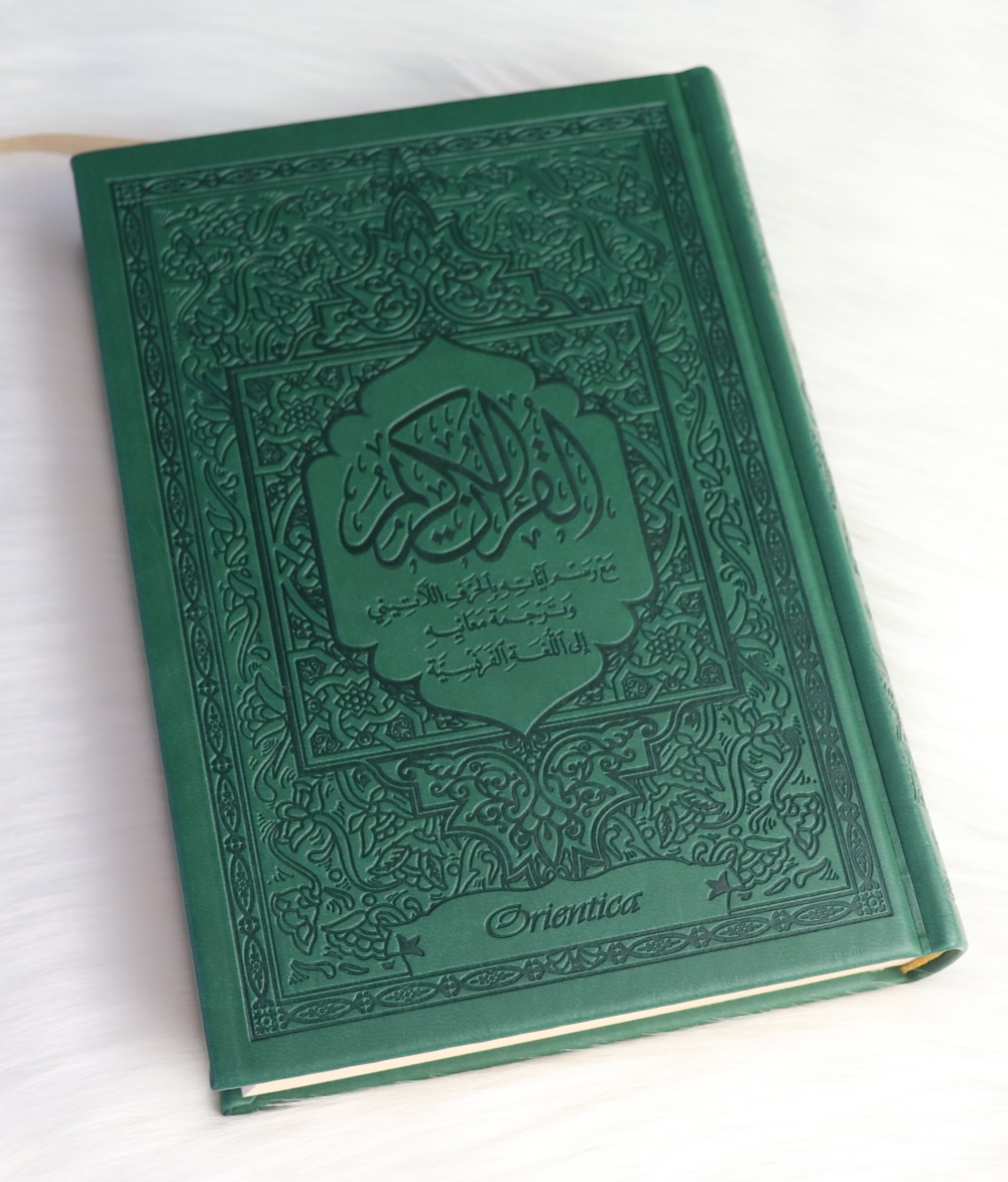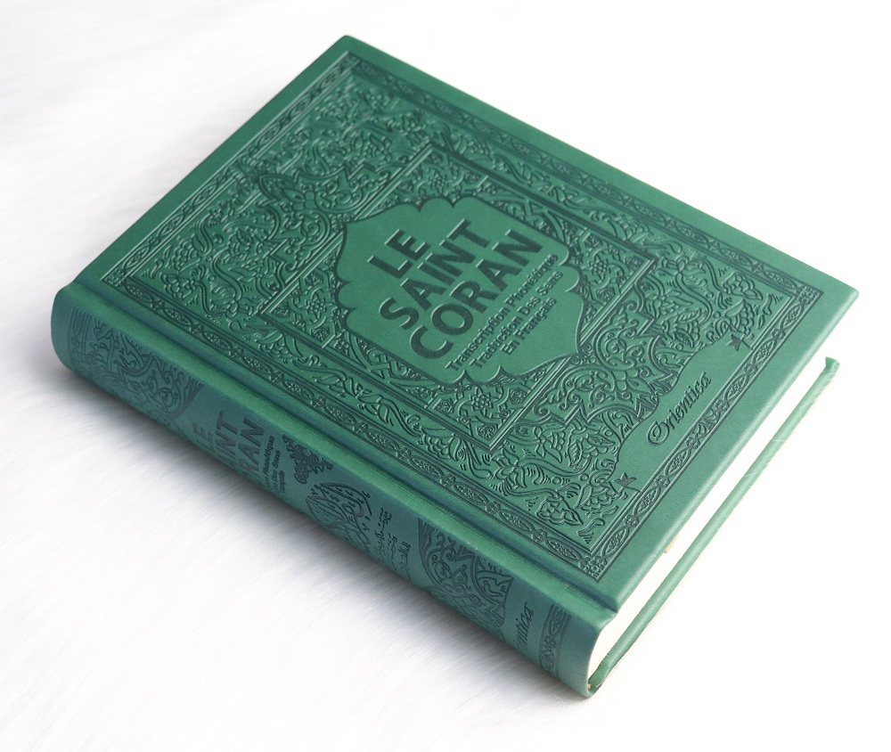 Magnifique Coran avec couverture cartonnée de type cuir/cuir, doux au toucher. Très jolie couleur vert sapin. Idéal pour offrir.