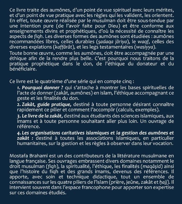 Ce livre traite des aumônes, d'un point de vue spirituel avec leurs mérites, et d'un point de vue pratique avec les règles qui les valident, les orientent. En effet, toute oeuvre réalisée par le musulman doit être sous-tendue par une intention pure (de l'avoir faite pour Dieu) et être conforme aux enseignements divins et prophétiques, d'où la nécessité de connaître les aspects de fiqh. Les diverses formes des aumônes sont étudiées : aumônes recommandées libres, celles durables (sadaqa jâriya), le waqf, celles des diverses expiations (kaffârât), et les legs testamentaires (wasiyya). Toute bonne œuvre, comme les aumônes, doit être accompagnée par une éthique afin de la rendre plus belle. C'est pourquoi nous traitons de la pratique prophétique dans le don, de l'éthique du donateur et du bénéficiaire.