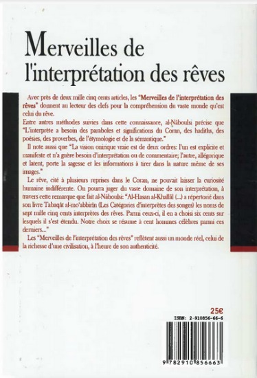 Avec près de deux mille cinq cents (2500) articles, les “Merveilles de l’interprétation des rêves” représente un dictionnaire très complet sur l’interprétation des rêves selon la tradition musulmane. Il donne au lecteur les clefs pour la compréhension du vaste monde qu’est celui du rêve.