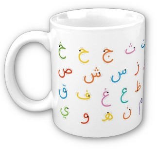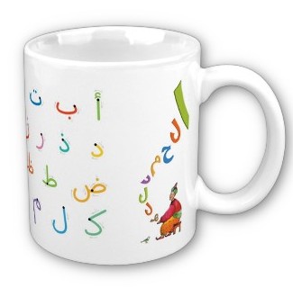 Mug "J'apprends à écrire l'arabe" avec les lettres de l'alphabet arabe montrant avec des flèches la façon de les écrire.